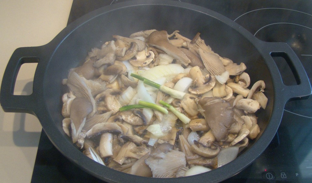 PREPARACIÓN: ponemos a calentar el aceite y añadimos la cebolla, cuando esté transparente los vegetales a fuego vivo. Podemos añadir un poco más de aceite o agua si es preciso (puede que se peguen). Por último, salpimentamos al final para que los hongos no suelten el agua demasiado pronto.
