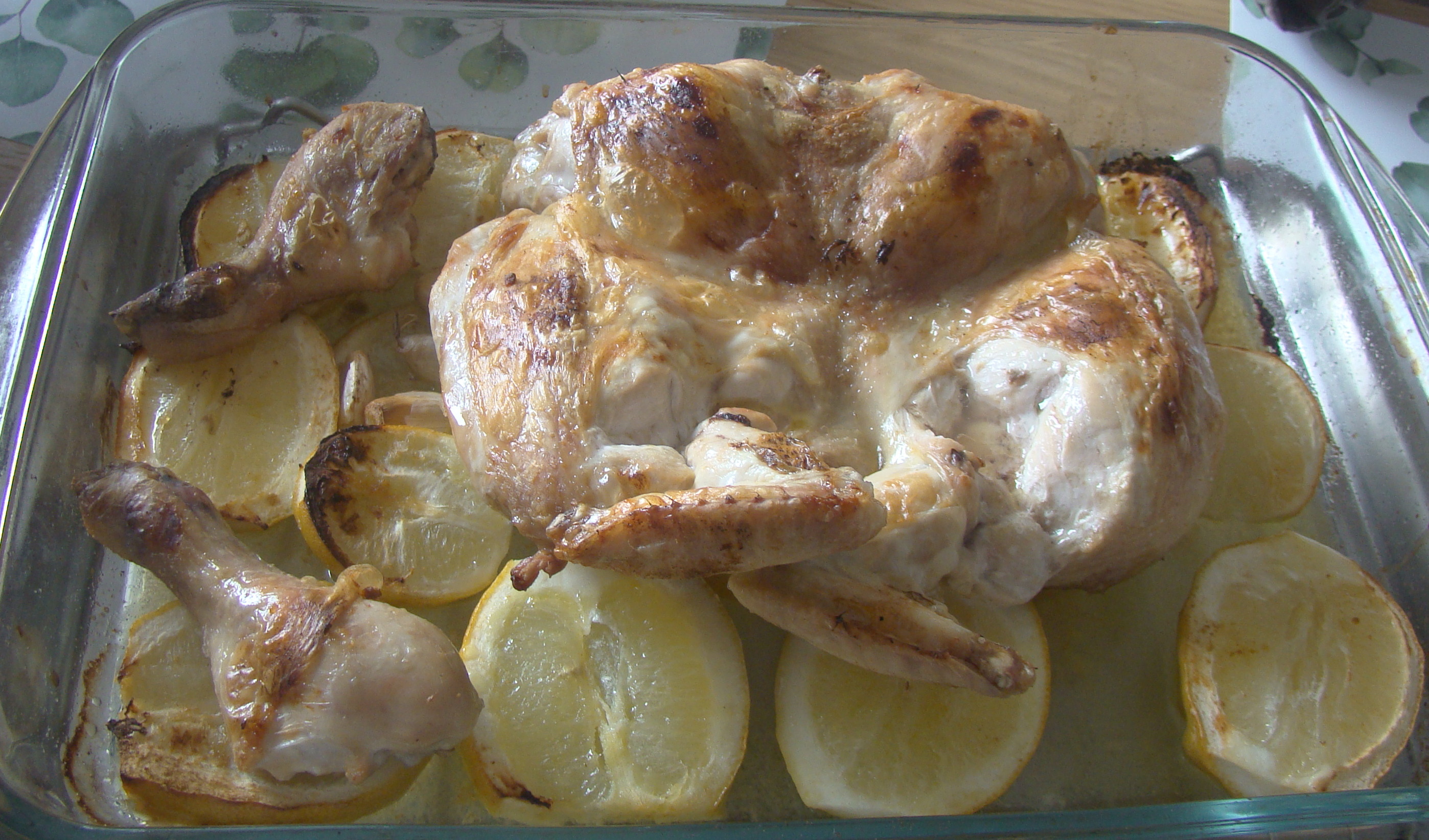PREPARACIÓN: ponemos en una bandeja los limones cortados, encima el pollo con el aderezo (el aceite con el comino y la sal). Asamos 15 minutos a 180º grados, le damos la vuelta y mantenemos 15 minutos más. Apartamos y servimos.