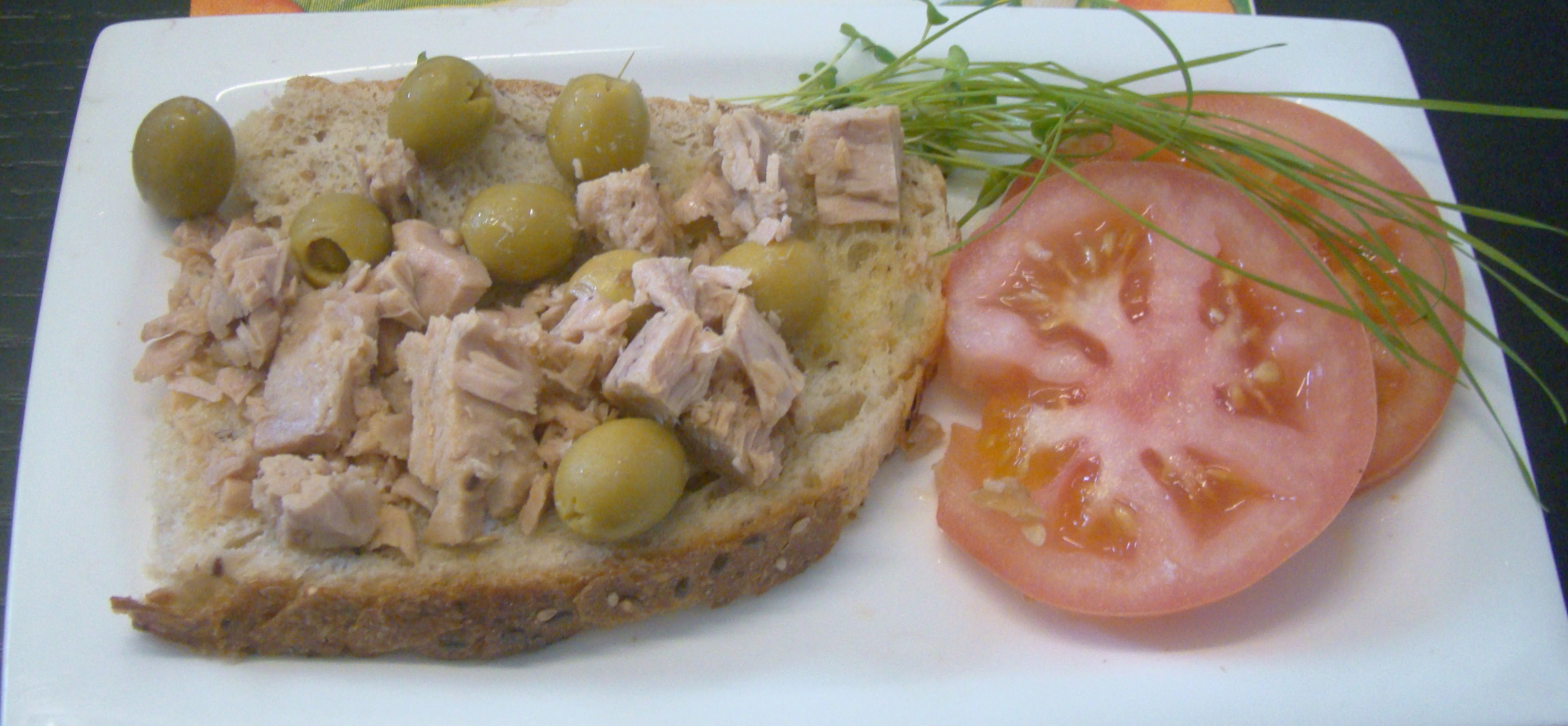 INGREDIENTES: 1 loncha de pan, 1 lata pequeña de atún y aceitunas.