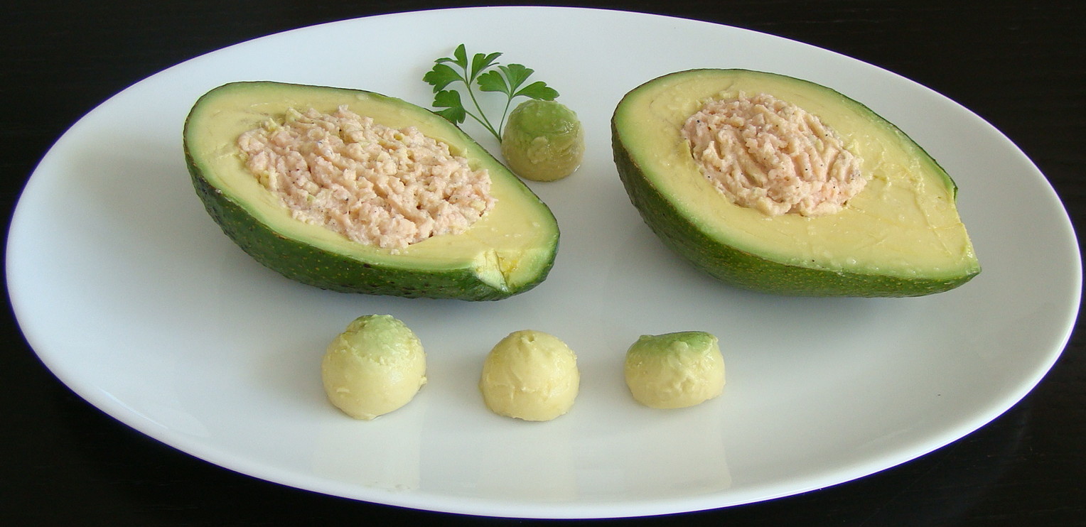 PREPARACIÓN: Preparar una crema poniendo, en el vaso de la batidora, el zumo de limón, la mantequilla y el salmón ahumado picado. Triturar hasta obtener una mezcla y sazonarla con pimienta al gusto. Por otra parte, cortar los aguacates por la mitad, a lo largo. Rocíe ligeramente la pulpa con zumo de limón, retirar el hueso y rellenarlo con la crema preparada. También puede utilizara atún fresco.