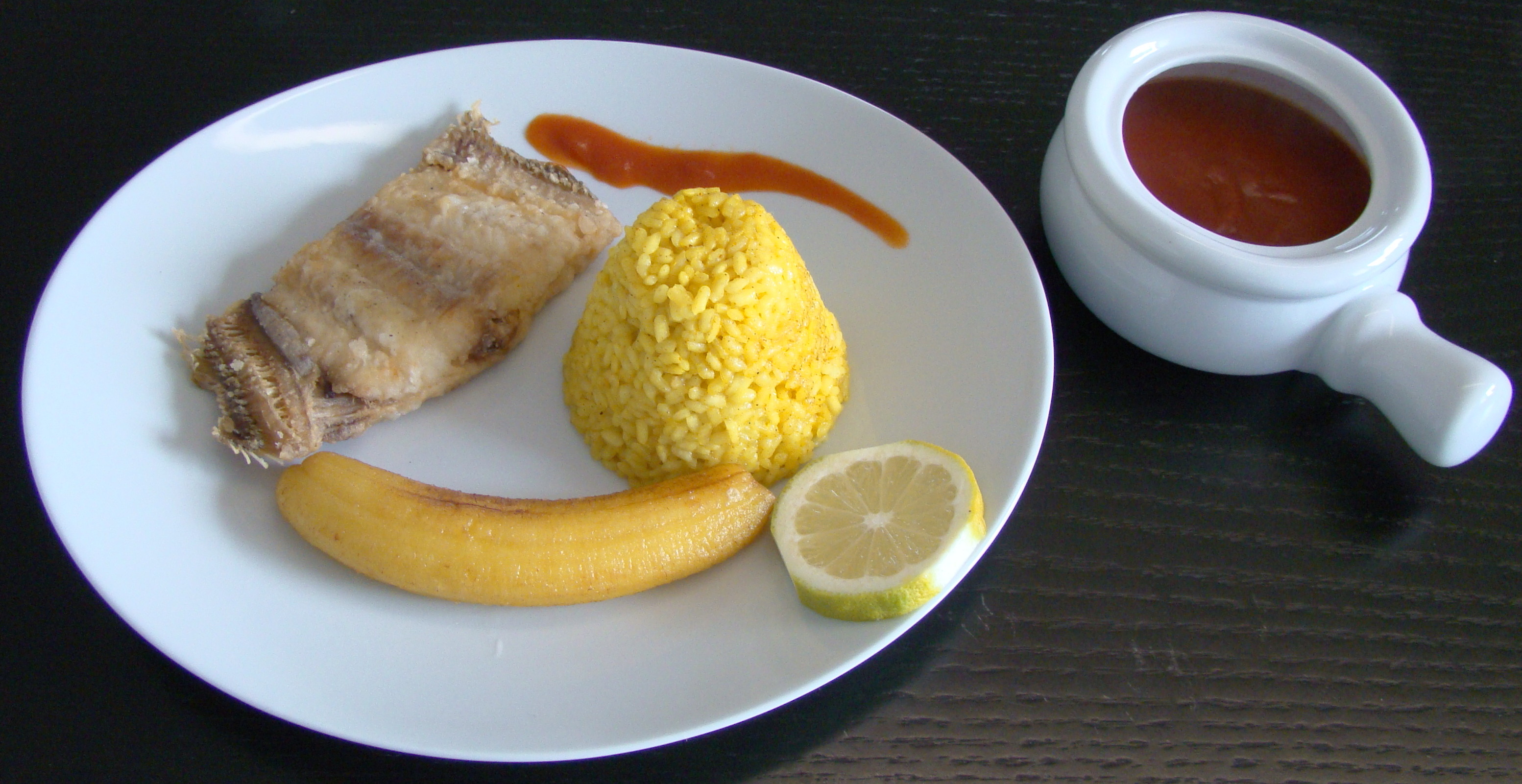 INGREDIENTES: 2oo gr. de arroz, 125 gr. de millo, 1 tomate, pelado, 1 cebolla picada en pequeños trocitos, 1/2 piña natural, 3 ´plátanos no muy maduros, un poco de perejil estragón aceitunas negras, 1 pimiento rojo, 2 cucharas de alcaparras.