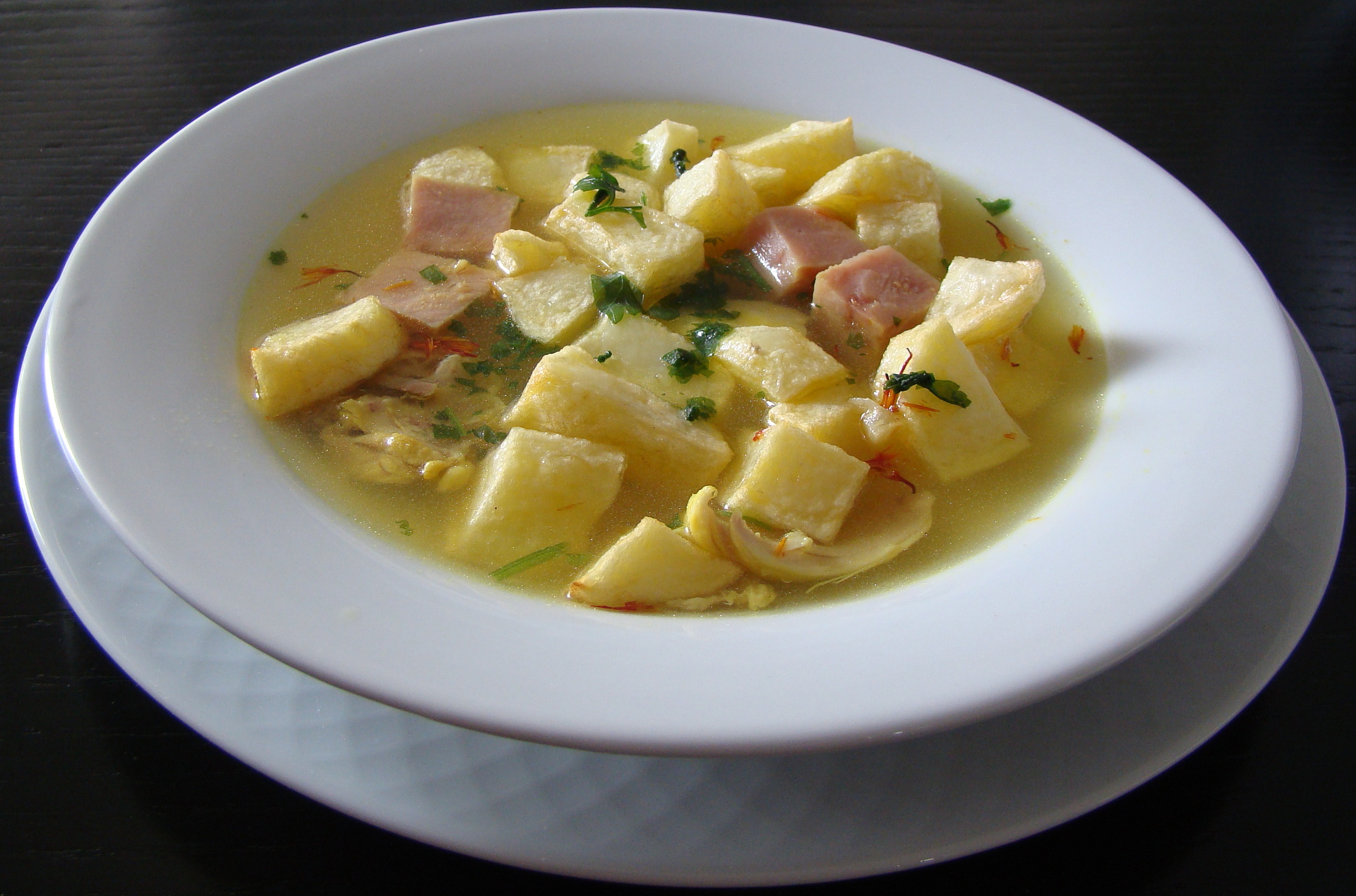 PREPARACIÓN: Se fríen el pan, los dientes de ajos, cominos y el perejil, todo majado se le añade al caldo. Se deja hervir junto con los trocitos de jamón o pollo guisado. Se le mezclan las papas fritas picadas menudas, dejándolas hervir cinco minutos. A este plato se le puede añadir dos o tres huevos batidos.