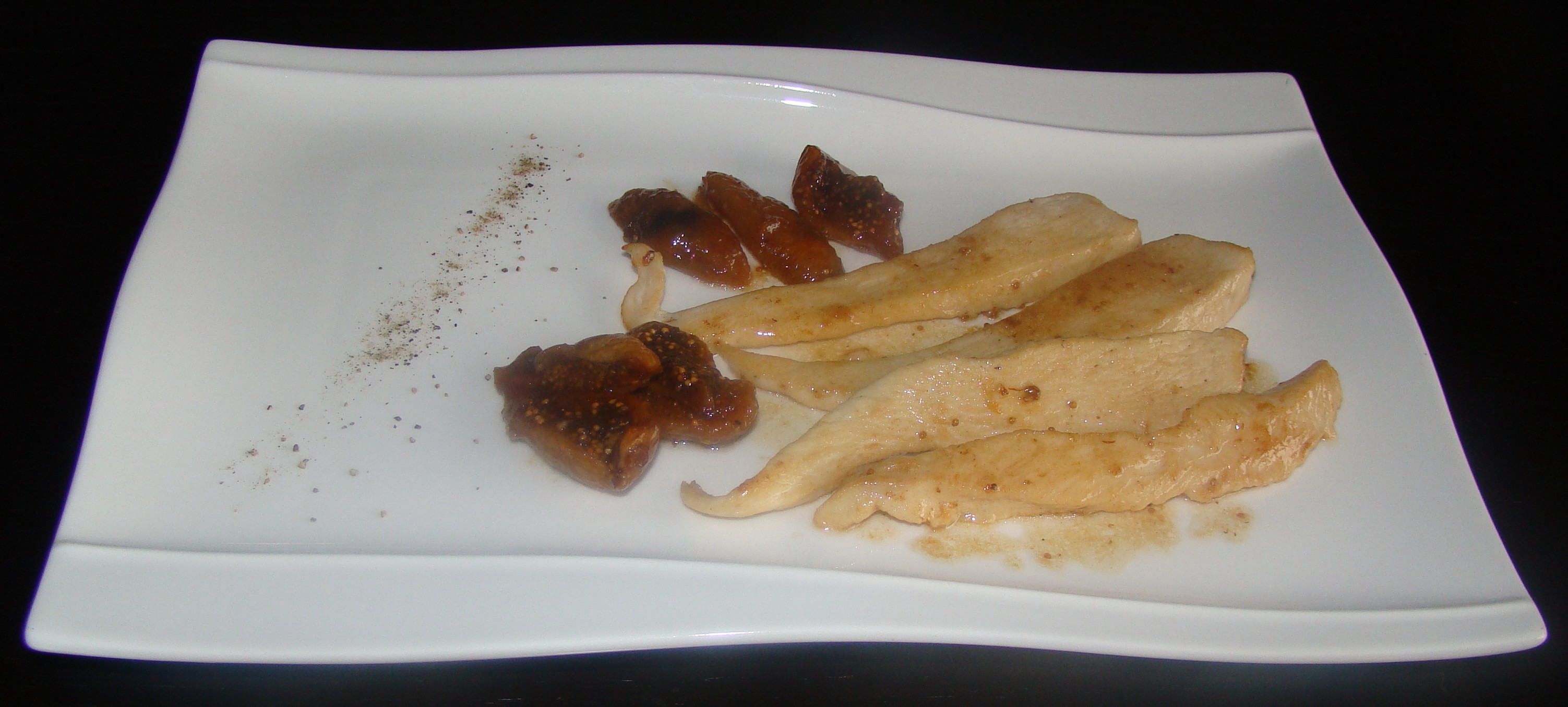 PREPARACIÓN: cortamos la pechuga en tiritas. Se pone una cucharadita de aceite en la sartén y se dora (no freír), añadirle sal y pimienta (vuelta y vuelta). Apartamos las pechugas y se ponen las otras 2 cucharadas de aceite. Se pelan los higos y se parten en gajos. Se unen a la sartén con el aceite tibia. Se le dan vueltas para que se guisen un poco. Después de 5 a 7 minutos se añade la pechuga y se remueve todo con los higos, que han quedado en una especie de crema pastosa. Se pueden acompañar de ensalada de pimientos asados o de habichuelas guisadas.