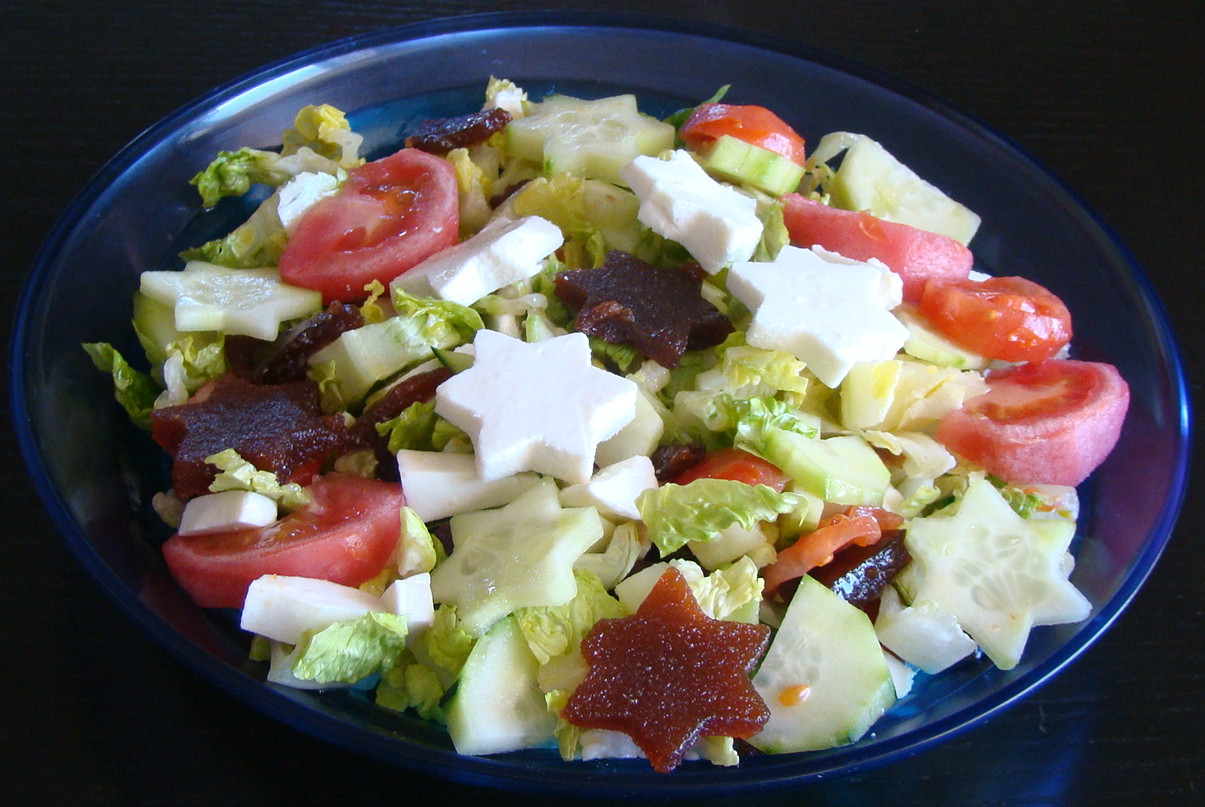INGREDIENTES: 1 tomate, 1 lechuga, 1/2 pepino, 1 lata de atún, 150 gramos de queso blanco tierno, 200 gramos de dulce de membrillo, aceite de oliva virgen extra, vinagre de manzana.