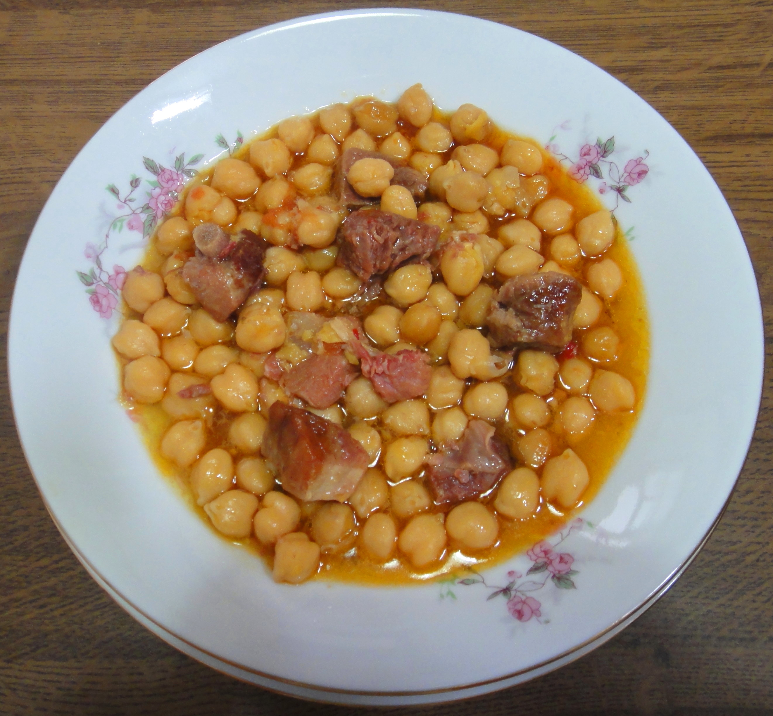 PREPARACIÓN: lavar bien antes poner al fuego. En olla o caldero agua que cubra las garbanzas, antes echar las garbanzas. (El agua tiene que estar un poco caliente) Poner la carne, quitar la espuma que se hace al estar guisando las garbanzas y la carne) Mientras hacer la fritura; cebolla picada, el ajo, tomate y el pimiento encarnado. Una vez hecha la fritura, agregarla dejar hervir como media hora o una hora, cuando estén las garbanzas. Machacar en un mortero un ajo con unas ramas de perejil una vez apagado el fuego echarlo. Son una verdadera delicias. Se las recomiendo que las haga tal cual. Receta cedida por Rosa Lorenzo Linares (Lola)
