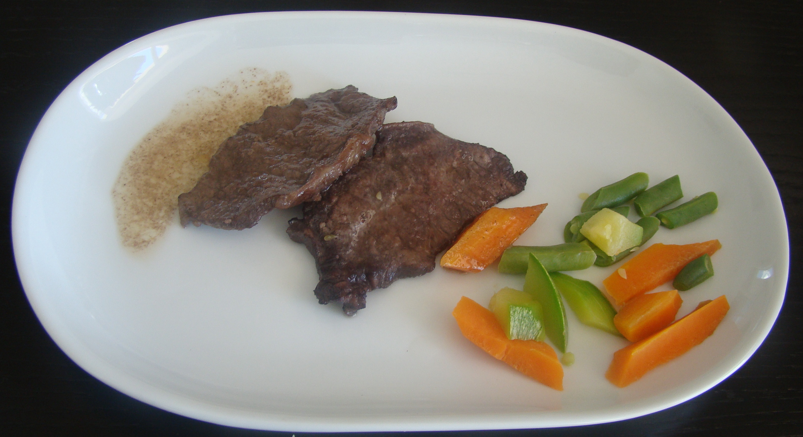 INGREDIENTES: 4 Filetes de ternera, 60 ml de vino tinto, 1 cuchara de limón, 1/2 de aceite de oliva, 2 zanahoria, 1 bubango pequeño, 1 cucharadita de harina de maíz, 180 ml de agua, 1 diente de ajo machacado, 3 cucharaditas de mermelada de ciruela, 2 cebollas cortadas a la juliana. Y 100 gramos de habichuelas.