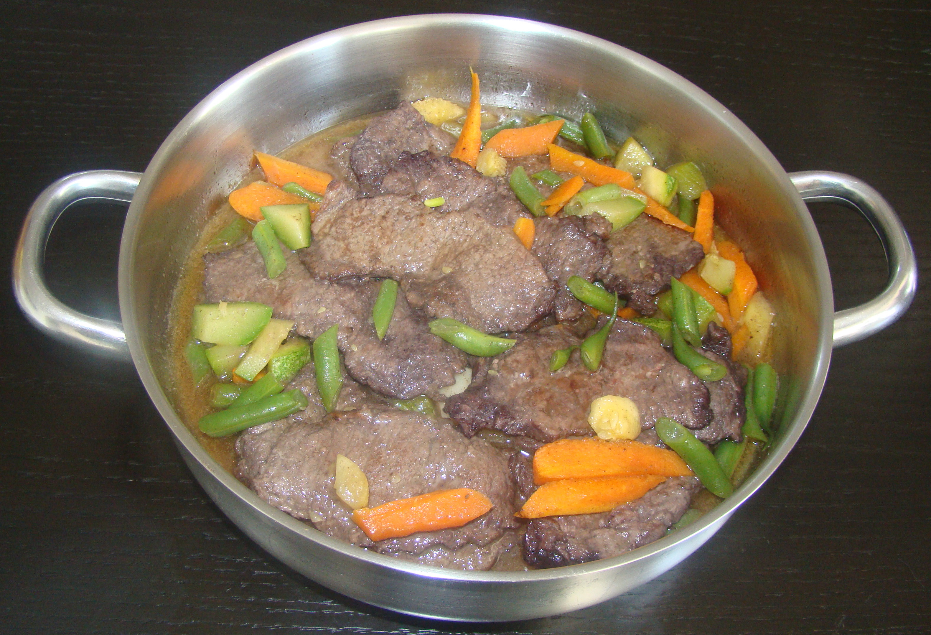 PREPARACIÓN: Retirar toda la grasa visible de la carne y golpearla un poco con una maza. Echar en un cuenco la carne con el vino y el zumo del limón. Dejarla con el adobo dentro de la nevera 2 horas o toda la noche. Escurrir la carne y reservar el adobo. Calentar el aceite en un sartén y dorar la carne . sacarla del sartén. Cortar la zanahoria y el bubango en tiras, hervir las verduras hasta que estén tiernas. Mantenerlas calientes. Mezclar en el sartén la harina de maiz con el adobo reservado. Agregar el agua, el ajo y la mermelada. Remover al fuego hasta que mezcle bien y espese. Servir la carne con la salsa y cubrirla con las verduras y las cebollas ó papas guisadas…