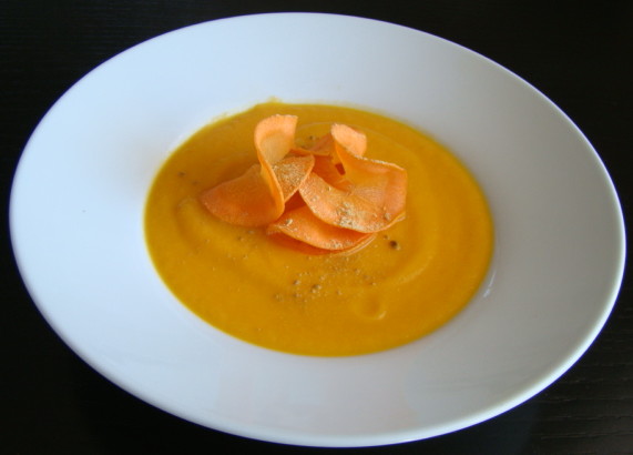 PREPARACIÓN: pele la cebolla y los dientes de ajos y píquelos. Pele las zanahorias y córtelas en dados, lave el apio y trocéelo. Pele el jengibre y rállelo. Caliente el aceite en un caldero adecuado y rehogue la cebolla con el ajo. A continuación, incorpore las zanahorias, el apio y el jengibre y rehogue 5 minutos más removiendo para que no se queme.Ponga el agua y deje guisar a fuego lento 30 minutos. A continuación tritúrela y salpimiente. Acompañar con unos trocitos de pan fritos.
