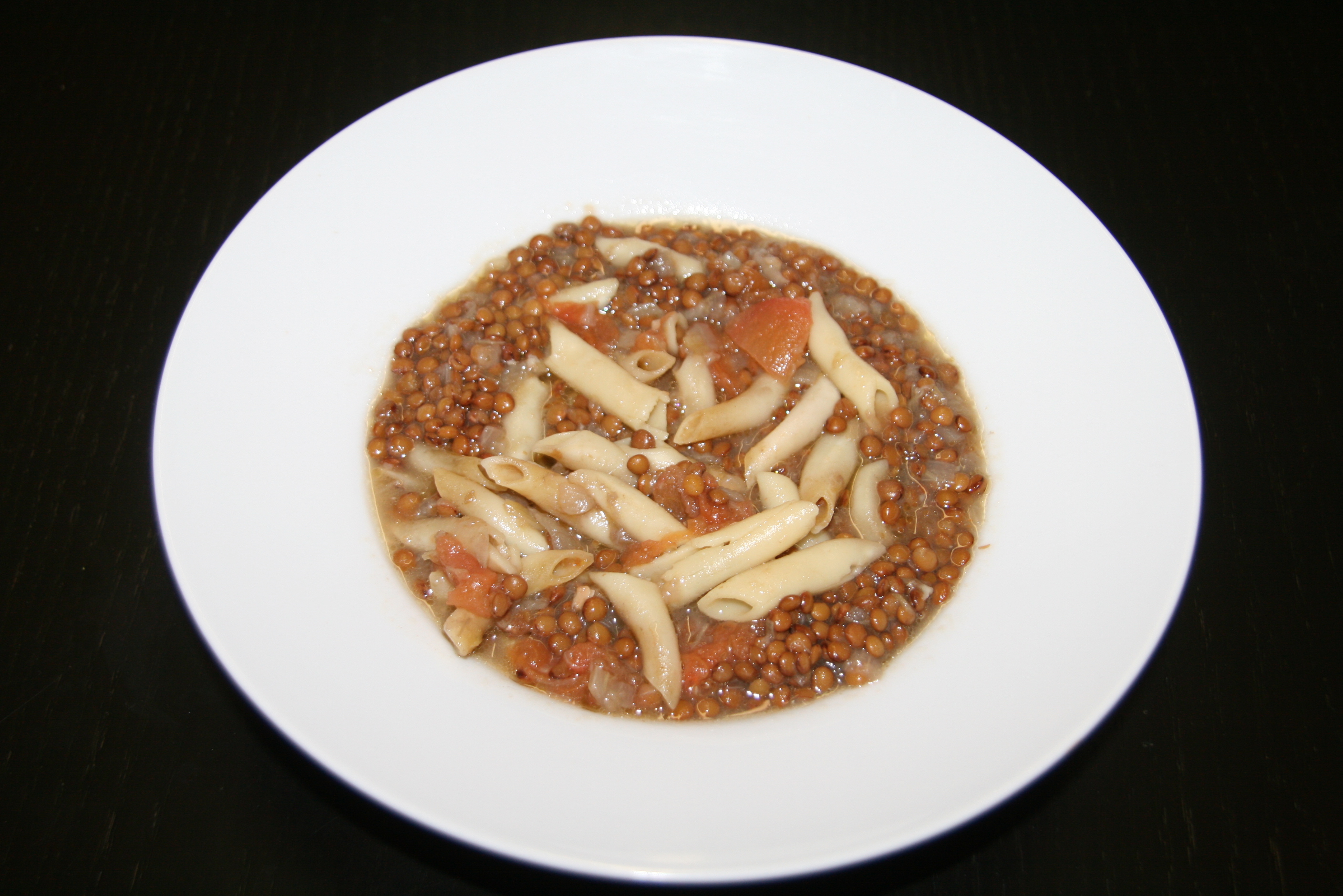 INGREDIENTES: 200 grs de lentejas secas, 100 grs de macarrones, 1 cebolla blanca, 2 tomates maduros, 2 dientes de ajos, 1 tallo pequeño de apio, 3 cucharadas de aceite de oliva, 1 hoja de laurel, sal y pimienta negra al gusto.