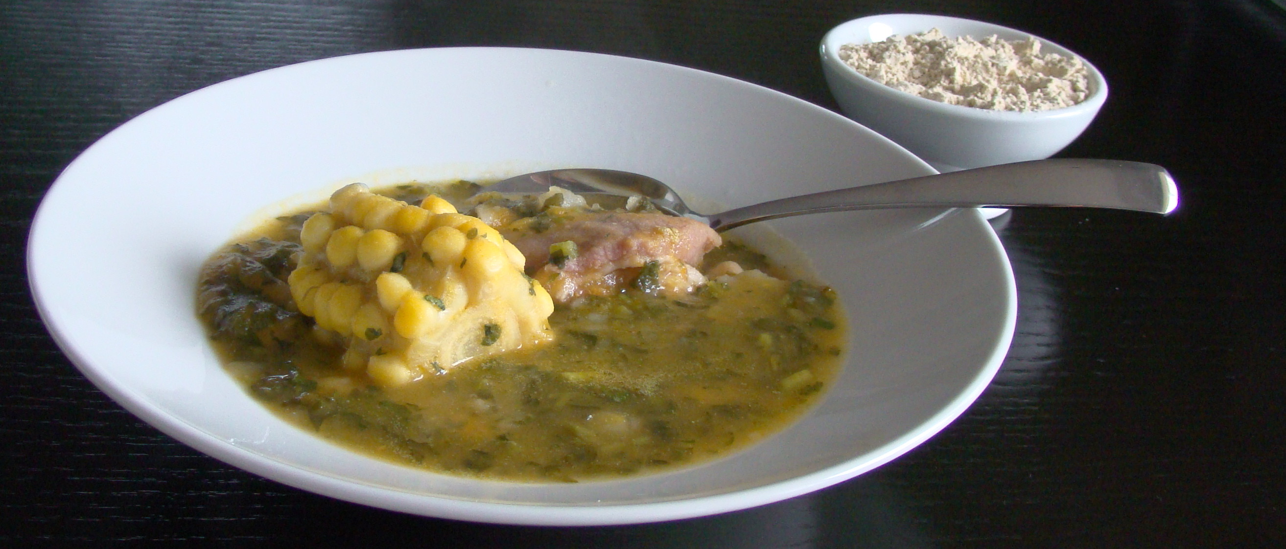 INGREDIENTES: 2 manojos de berros, un cuarto kilo de judías blancas, 1 kilo de papas, 1/2 kilo de calabaza, costillas de cochino saladas al gusto, 2 piñas de millo, 1 cebolla pequeña, 1 tomate pequeño, 4 dientes de ajos, 4 cucharadas de aceite 1 cucharadita de azafrán.