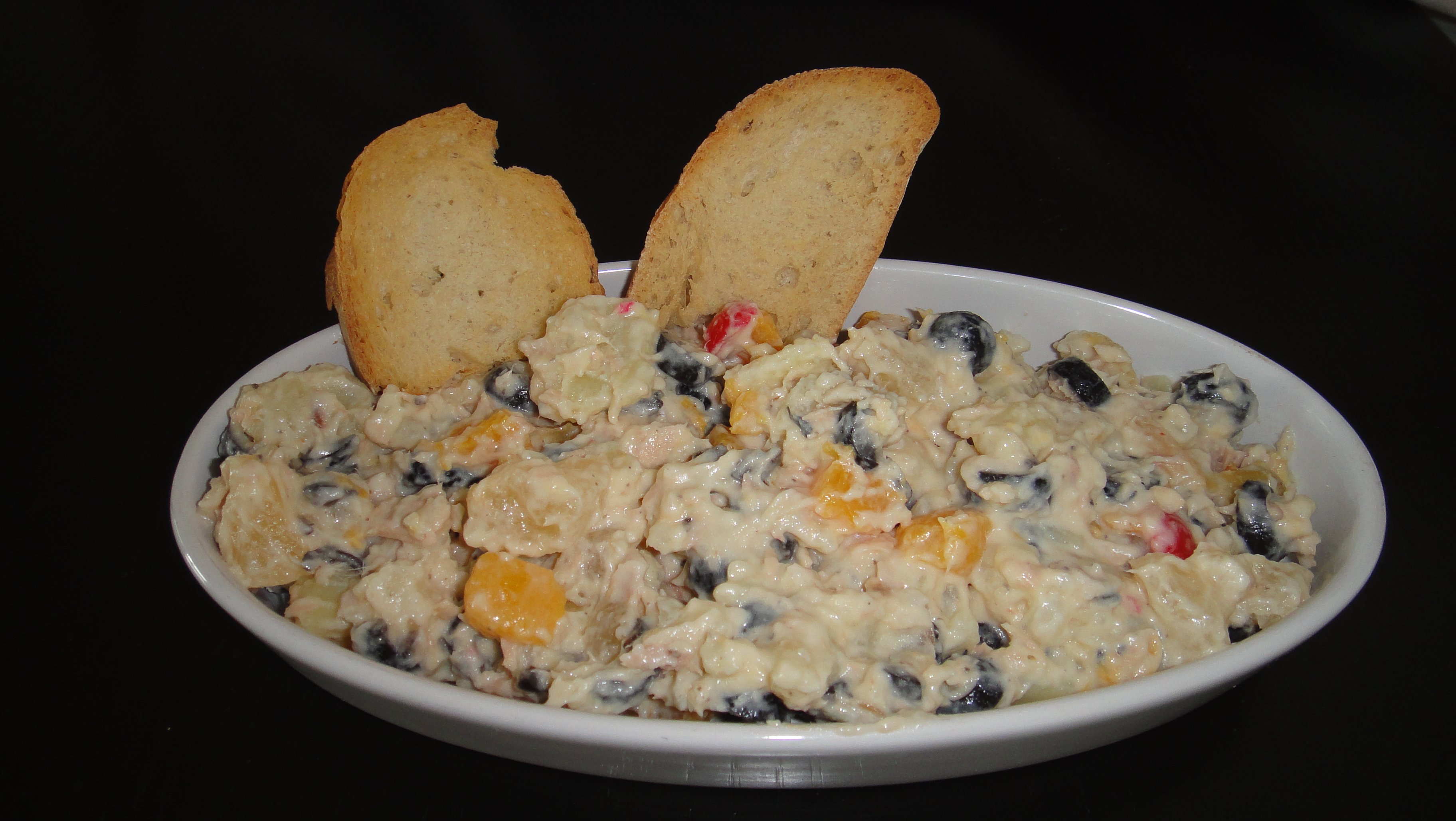 INGREDIENTES: 2 latas de melva de 12grs., 1 lata de 244 grs. de aceitunas negras ya troceadas, 1 lata de Cocktail de frutas de 425 grs., 1/2 Kgr. de papas y 1 bote de mayonesa de 225 grs.