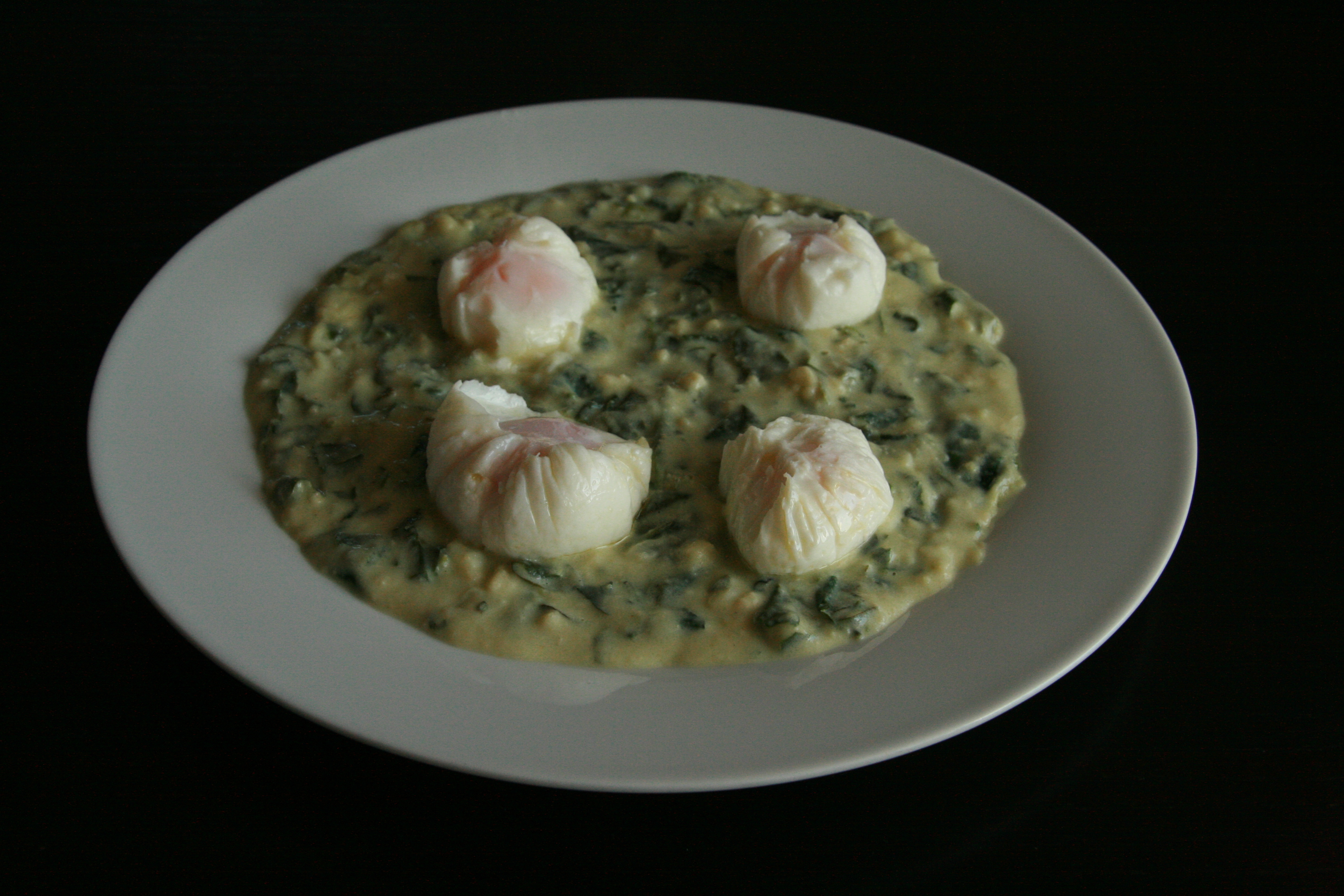 PREPARACIÓN: se pone en un sartén el aceite a calentar se echa la harina y se remueve hasta que tenga un color dorado. Se le va añadiendo la leche(si está caliente mejor) y removiendo sin parar para que no se hagan grumos cuando esté la masa se le añades la sal nuez moscada y las espinacas cortadas a trozos pequeños. Los huevos escalfados en un sartén ponemos agua unas gotas devinagre de vino unas gotas de aceite de oliva sal y añadimos los huevos