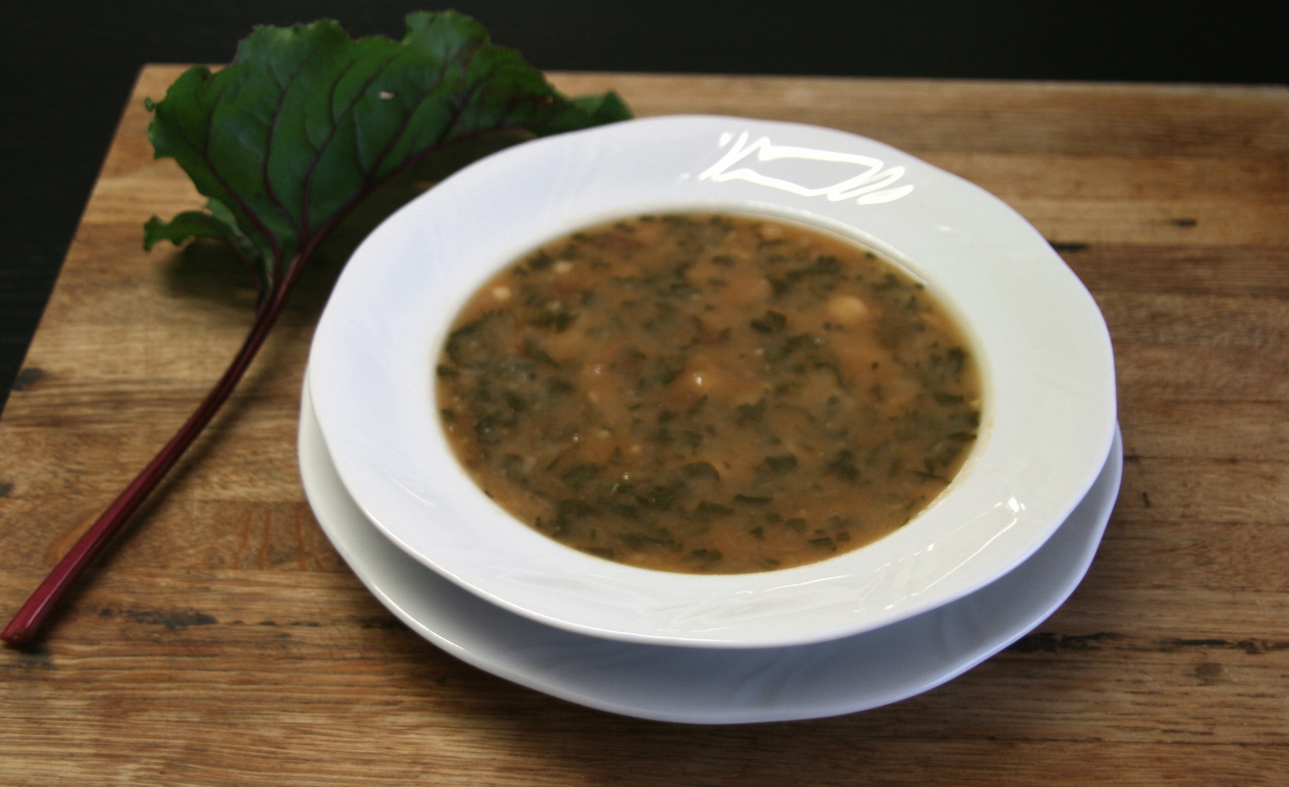 INGREDIENTES: 4 hojas de beterrada, 2 dientes de ajo,1 cebolla blanca pequeña, una cuchara sopera de aceite de oliva, 100 grs. de garbanzos (previamente puestos en remojo el día anterior), 4 papas medianas y agua.