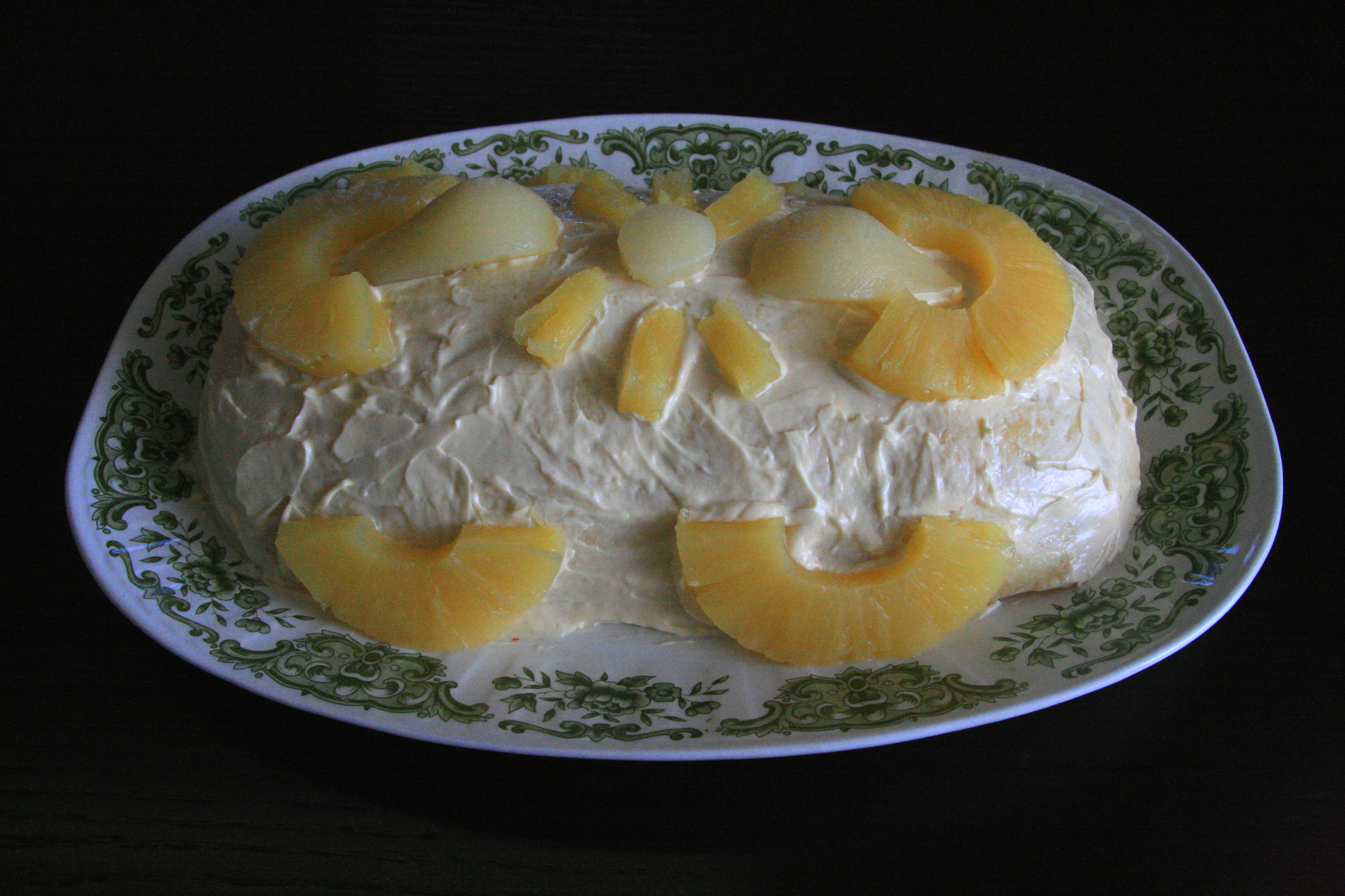 INGREDIENTES: 200 gramos de atún en aceite, 3 huevos duros, 1 bote de aceitunas rellenas de pimiento, mayonesa para cubrirlo, 1 cebolla mediana, medio pimiento rojo, 3 rodajas de piña, 2 peras en almíbar, 1 cucharada de aceite para el sofrito.