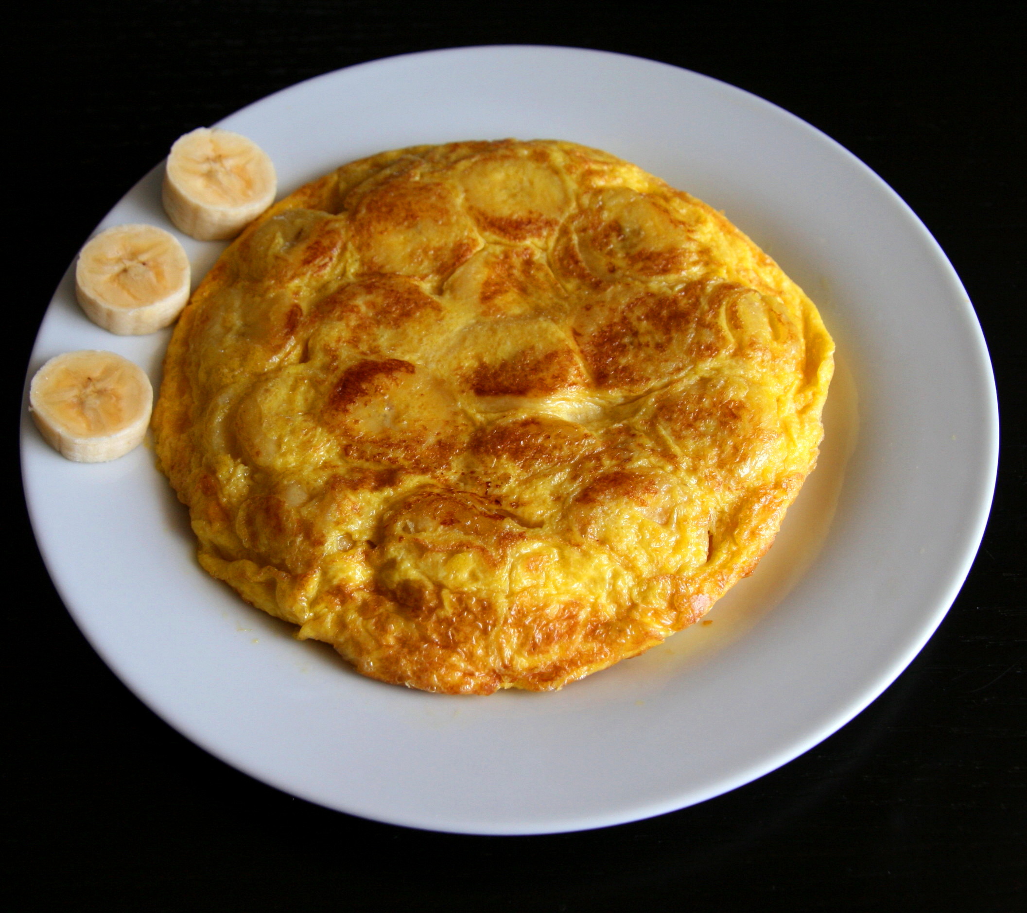 PREPARACIÓN: ponemos el sartén al fuego con el aceite. Calentamos añadimos los huevos cuajamos un poco y añadimos los plátanos cortados a su gusto. dejamos cuajar un poquito damos la vuelta. Y si está lista poner en un plato y comer calentita.