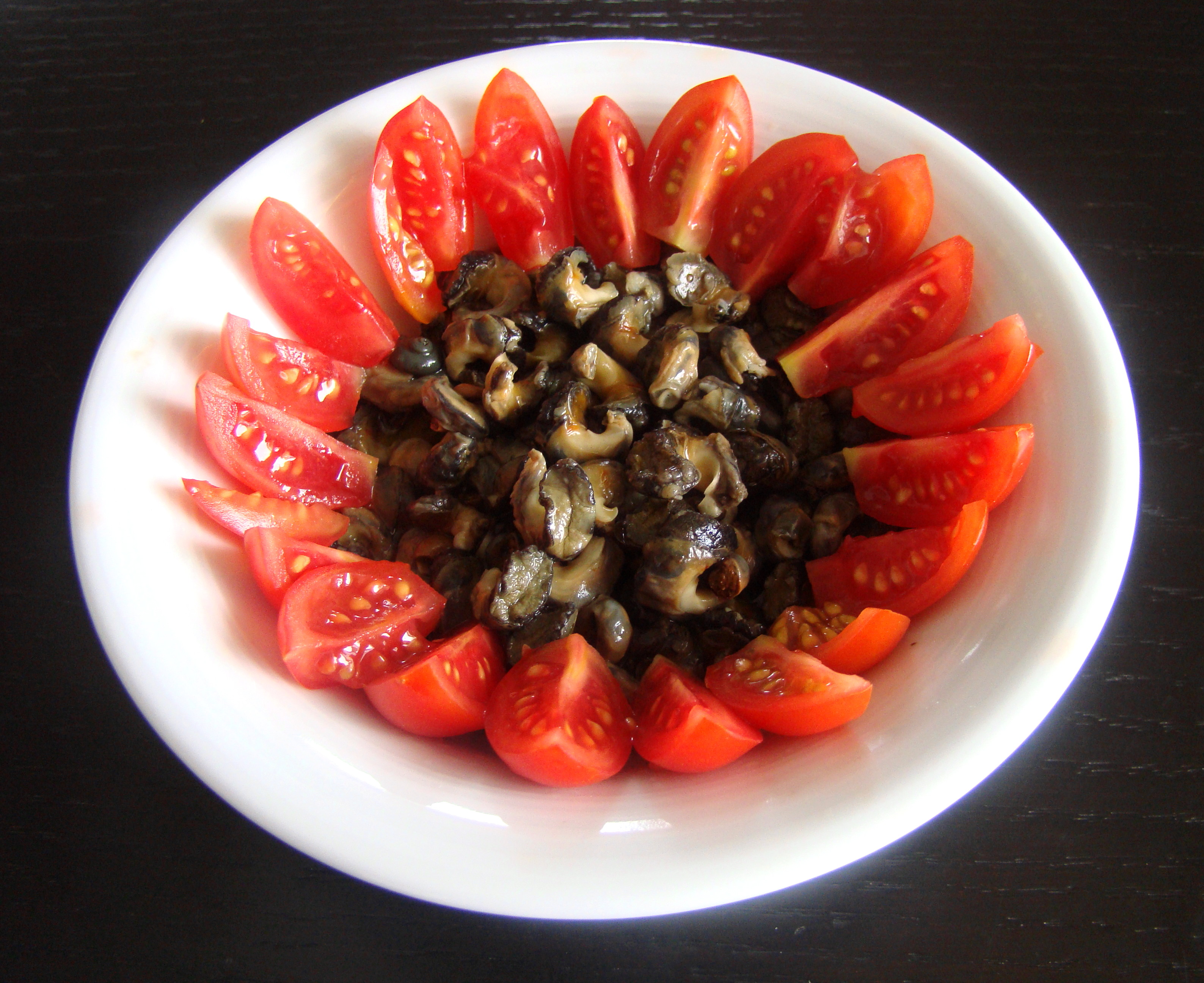INGREDIENTES: 150 gramos de burgados, 8 tomates pera, 1 cucharadita de vinagre, 1 cucharadita de aceite de oliva y sal.