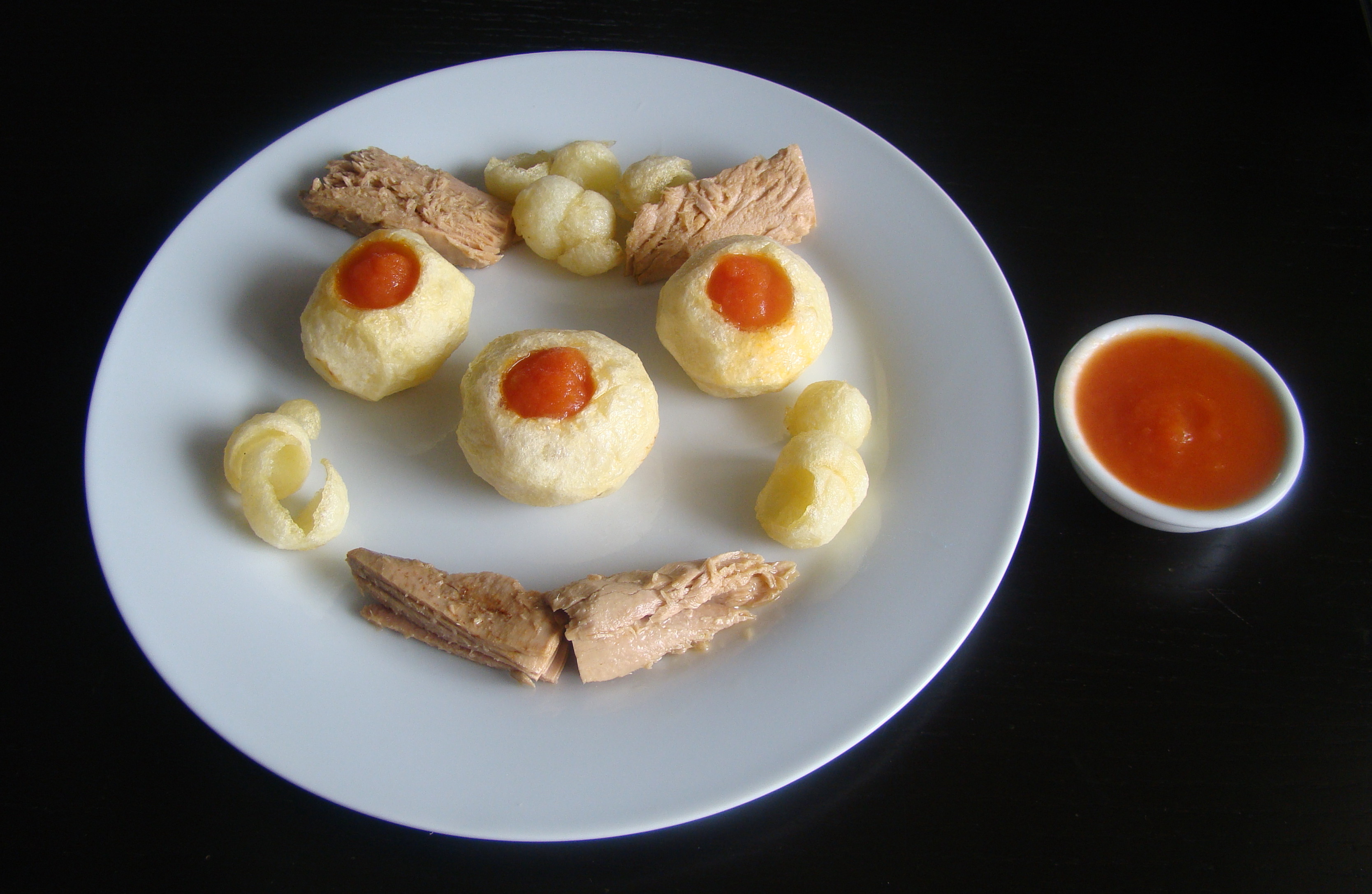 SUGERENCIAS: acompaña las papas con unos troncos de atún o arroz blanco. Las papas si las fríes en una freidora te quedaran mejor a fuego suave. Emplatado para animar a los pequeños  a comer.