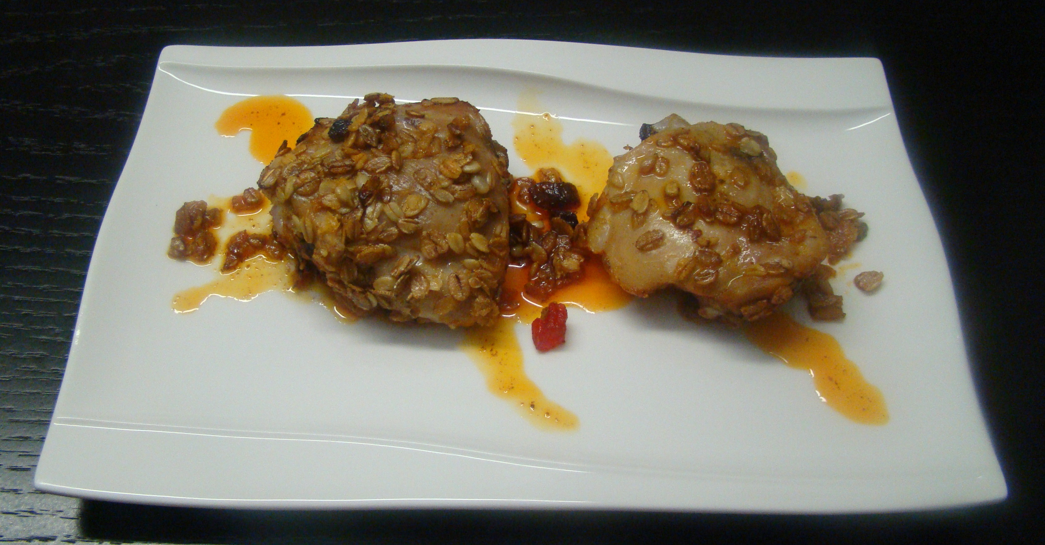 INGREDIENTES: 8 cadera de pollo, 3 cucharadas de aceite de oliva, 2 cucharadas de muesli de fruta, 1 cucharadita de pimentón dulce.