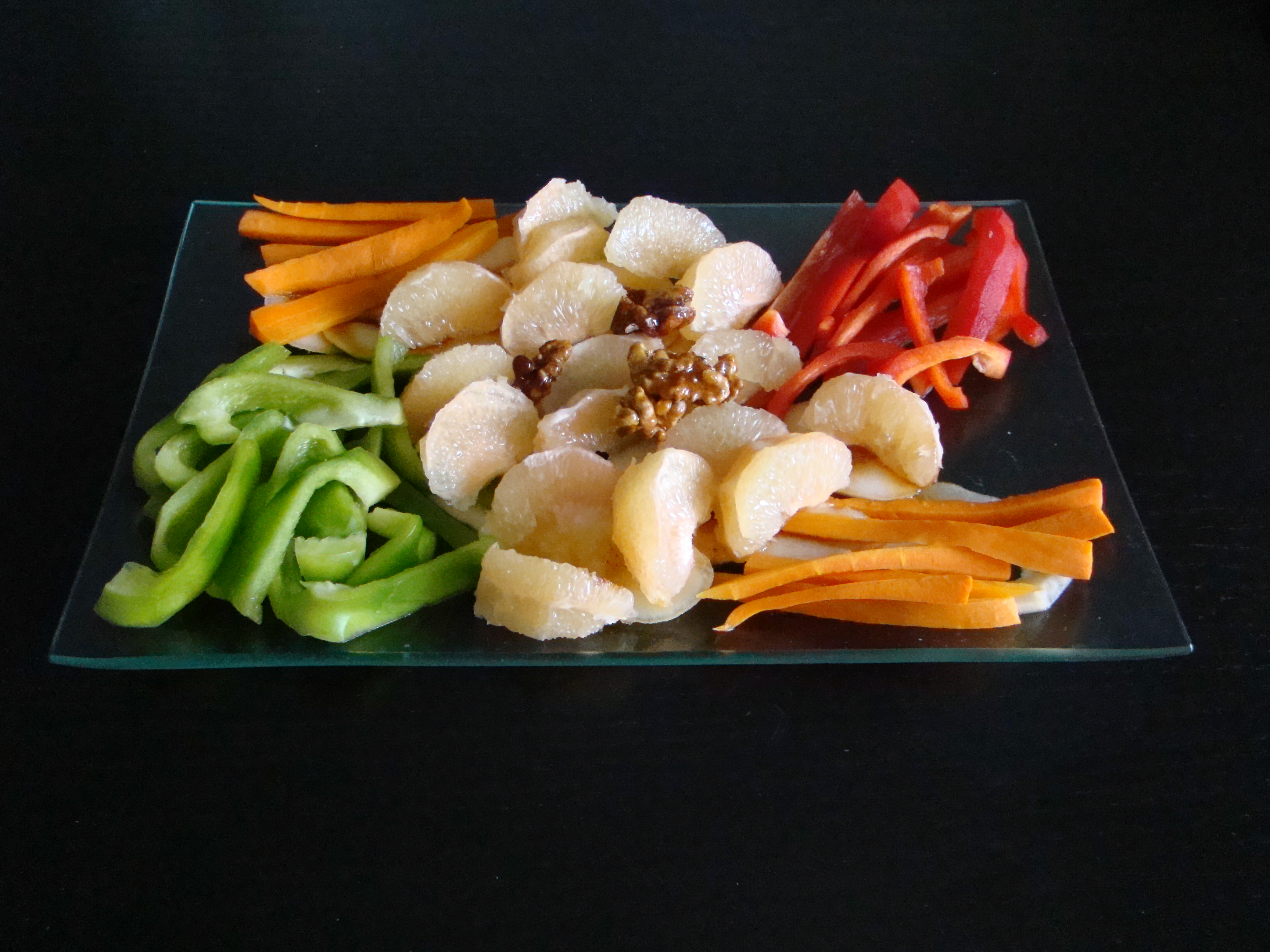 INGREDIENTES: 3 pomelos, 1 zanahoria, pimiento rojo, pimiento verde, 100 gramos de nueces caramelizadas
