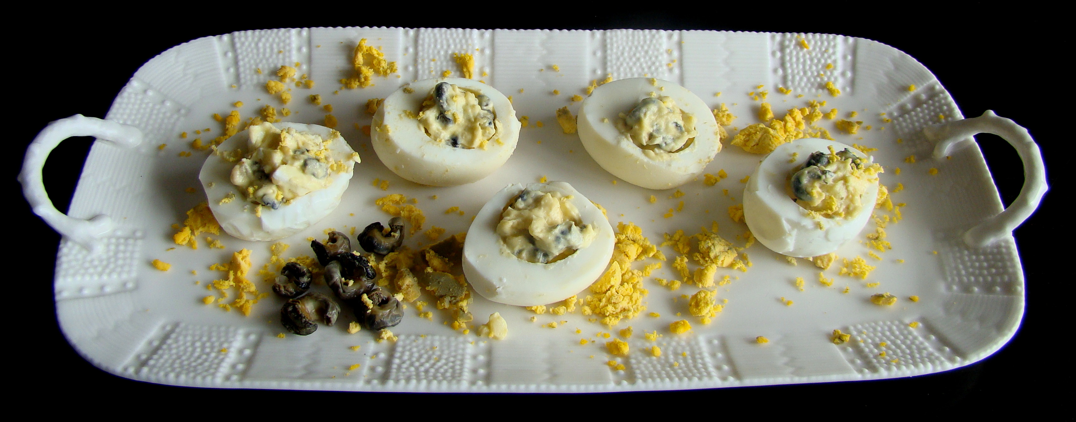 INGREDIENTES: 8 huevos, 3 cucharadas de burgados, 3 papas, 6 aceitunas verdes sin hueso, mayonesa.