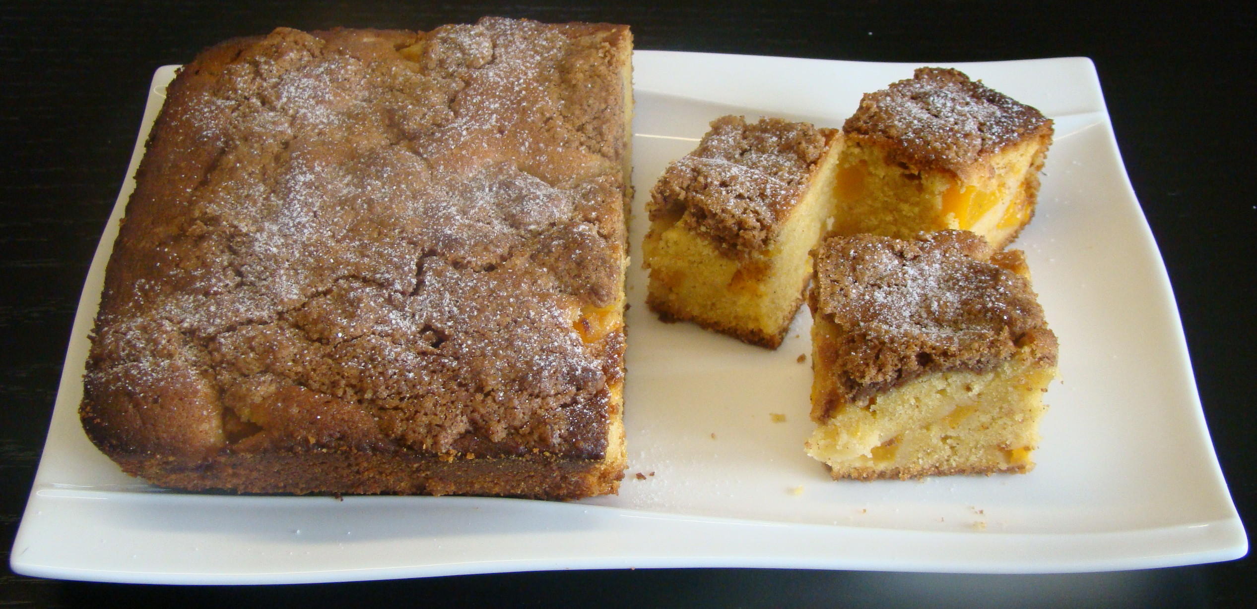 PREPARACIÓN: poner en un cuenco 30 gramos de mantequilla, dos cucharadas de harina, la azúcar morena y la canela, amasamos con los dedos hasta formar migas y reservamos. En otro cuenco ponemos el resto de la harina, la mantequilla, el azúcar blanco, la vainilla, batimos los huevos y los incorporamos mezclando, añadimos los melocotones y mezclamos de nuevo. Untamos el molde con una pizca de mantequilla y extendemos la masa en el molde. Añadimos por encima las migas cubriendo toda la bandeja. No olvidar calentar el horno a 180ªC antes de ponerlo, hornear durante 40 minutos. Comprobar antes de sacar.