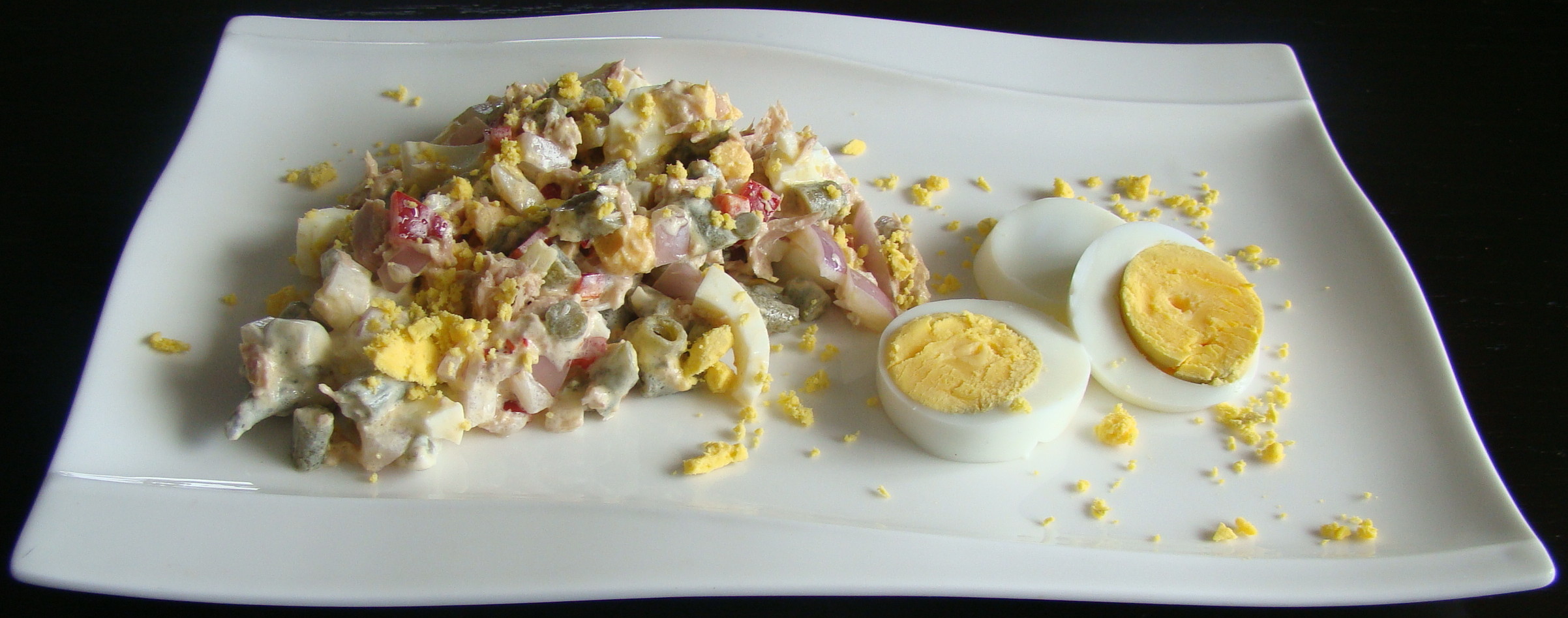 INGREDIENTES: 1/2 kilo de habichuelas tiernas, 1 lata de atún de 250 gramos, 1 cebolla roja, 1 pimiento rojo, 4 huevos duros,1 bote de mayonesa de 250 gramos.