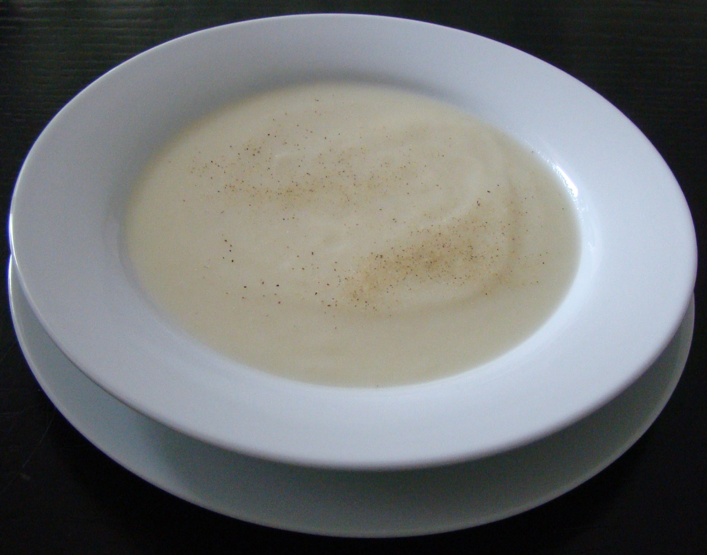 PREPARACIÓN: ponemos en un caldero el aceite y doramos los ajos. Agregamos la coliflor cortada en trocitos, las papas también troceadas y rellenamos con agua hasta un dedo por encima. Guisamos durante 15 minutos. Apartamos, molemos hasta obtener una textura de puré y al momento de servir le echamos una pizca de pimienta blanca.