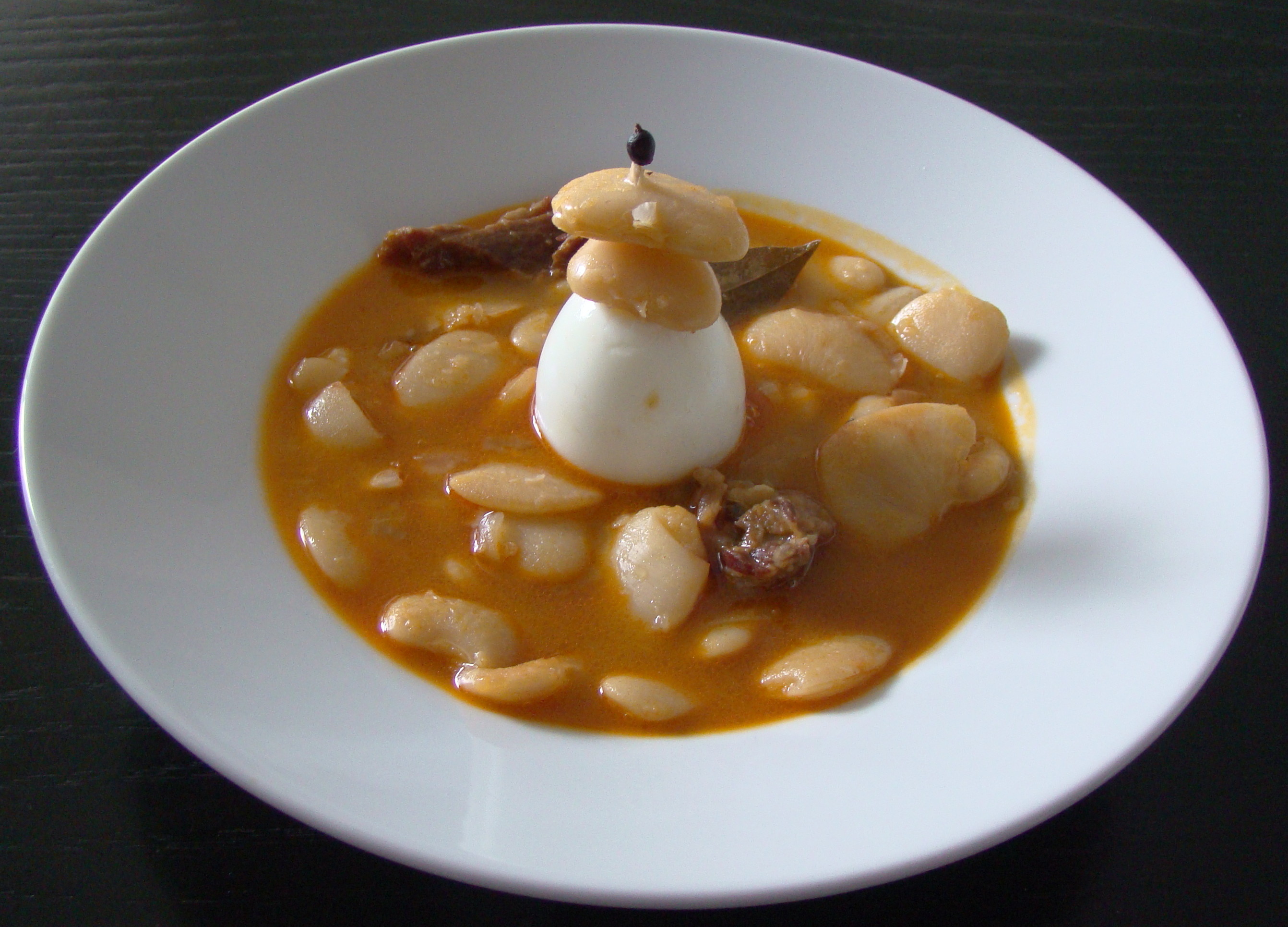 INGREDIENTES: 1/2 kilo de judías blancas, 1/4 kilo de jamón serrano, 3 cebollas blancas, 8 dientes de ajo, 4 cucharadas de aceite de oliva, una cucharada de pimentón de La Vera.