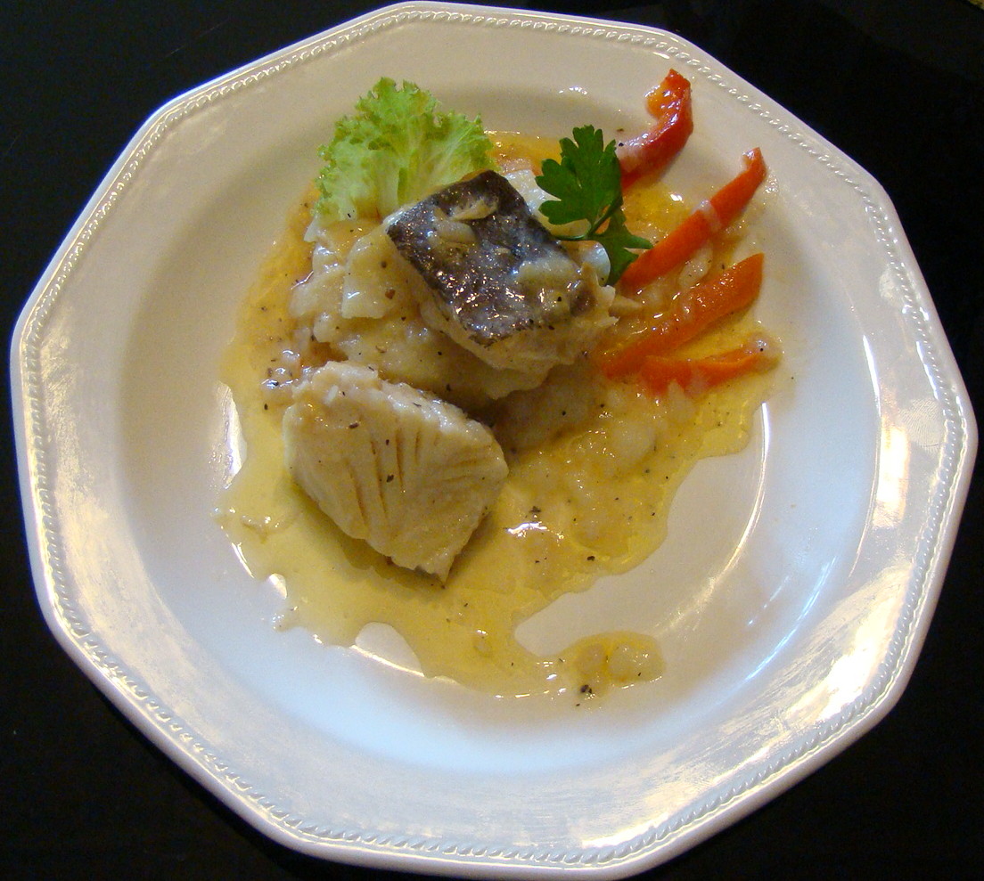 INGREDIENTES: 600 gramos de bacalao desalado, 2 cebollas tiernas grandes, 4 dientes de ajos, 1/2 vaso de vino blanco, 1 tomate maduro, 1 hoja de laurel, 1/2 pimiento rojo, 1 kilo de papas, 1 cucharadita de pimienta negra, 1 cucharada de harina, 4 cucharadas de aceite de oliva.