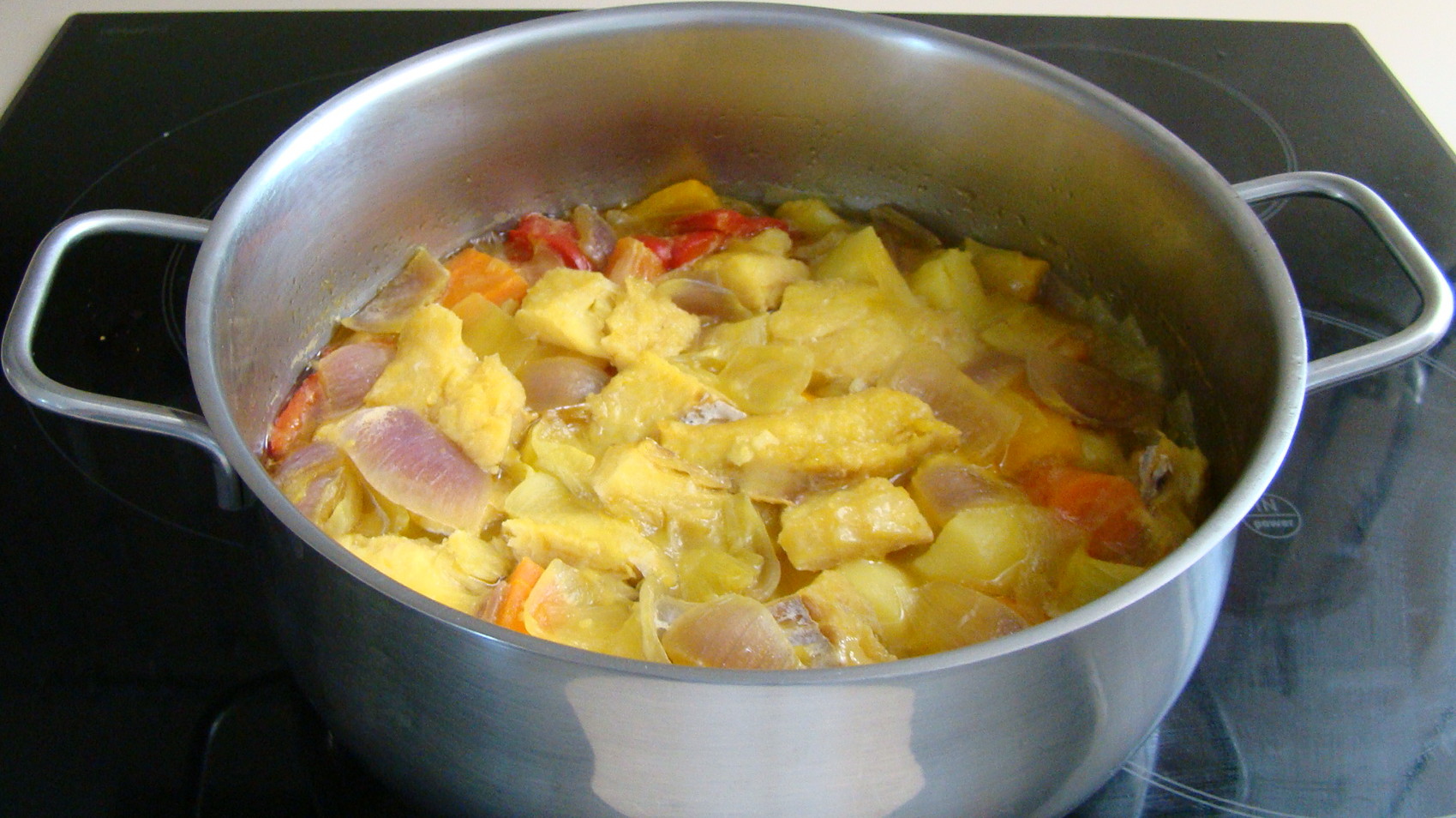 PREPARACIÓN: ponemos un caldero plano con el aceite. Cuando esté caliente añadimos los ajos, la cebolla picada a la juliana, el pimiento y pochamos. En un plato ponemos la harina, pasamos el bacalao y ponemos encima del sofrito. Guisamos y cuando esté el bacalao apartamos. En otro caldero pelamos y cortamos las papas en rodajas y guisamos. Podemos hacerlo por separado o junto en este caso lo he hecho junto: puse las papas encima de los ingredientes y por último el bacalao.