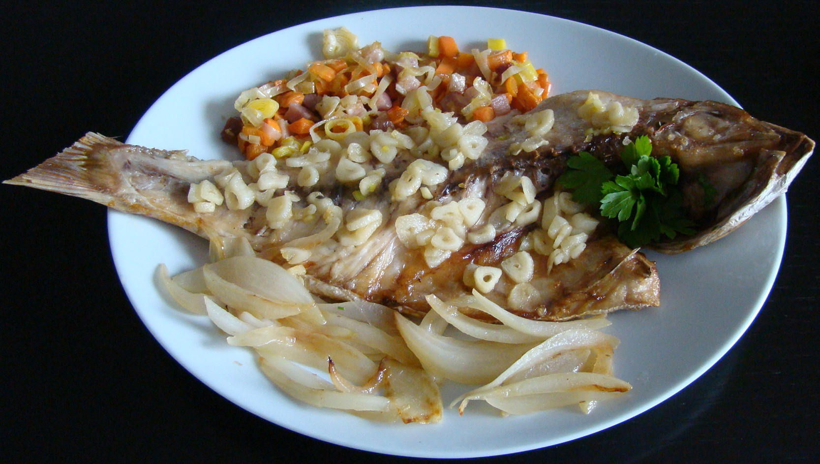 PREPARACIÓN: rociamos el pescado con 2 cucharadas de aceite y la sal. Ponemos en la bandeja al horno unos 20 minutos a 180ºC. Mientras se hace el pescado, pelamos y cortamos en trocitos pequeños las verduras, la panceta, el jamón y sofreímos. Apagamos el horno y con la puerta abierta dejamos el pescado. Freímos los ajos con solo una cucharada de aceite y los echamos por encima. Aparte cortamos la cebolla a la juliana y doramos. Utilizaremos como guarnición el sofrito y la cebolla.
