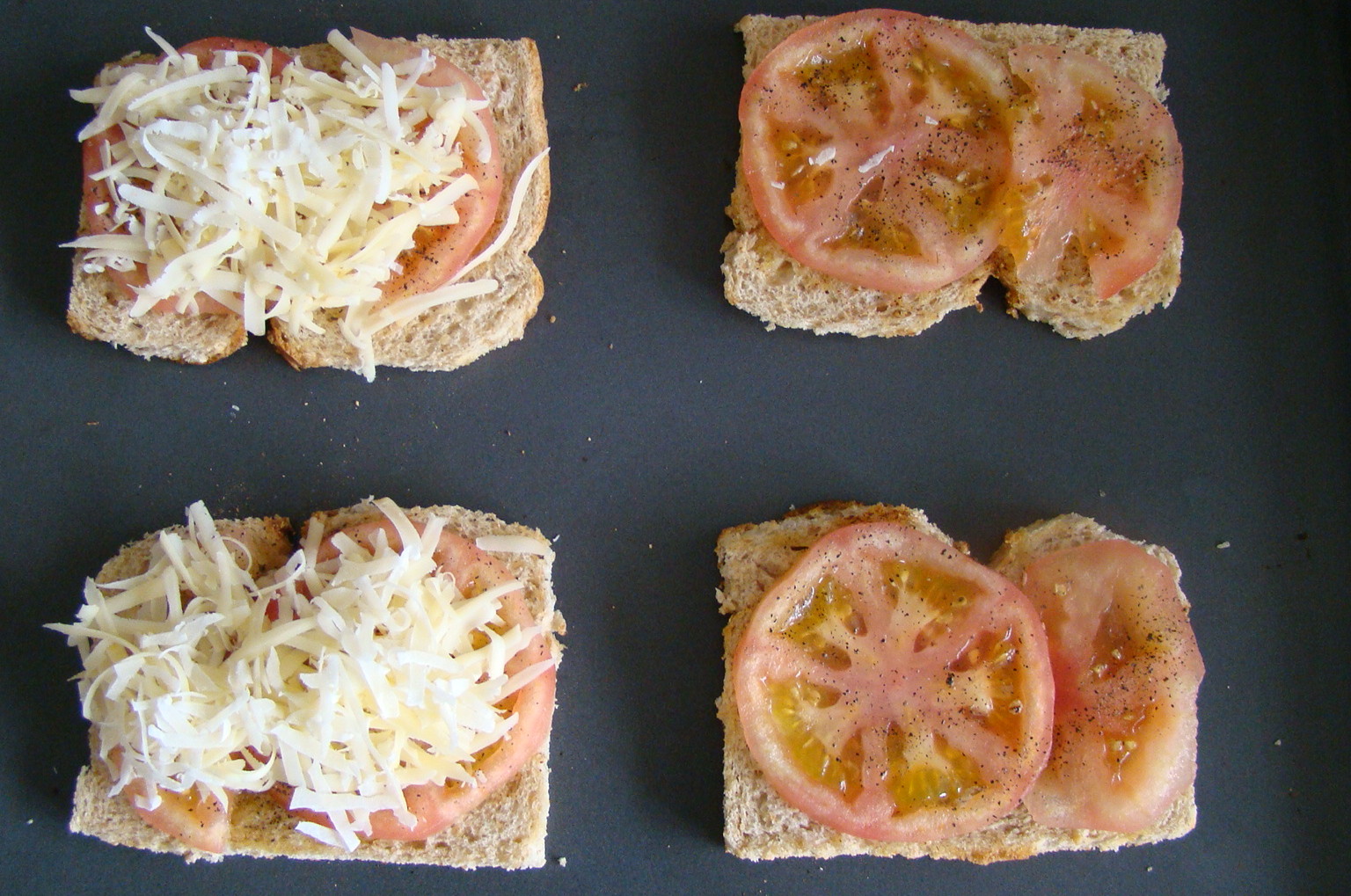 PREPARACIÓN: repartimos la cucharada de aceite en las rebanadas de pan, ponemos la sartén al fuego y doramos las rebanadas por ambos lados. Pelamos los ajos y escachamos en un mortero, ponemos un poco de ajo en cada rebanada, añadimos el tomate cortado en rodajas, y esparcimos las ralladuras de queso y la pimienta. Calentamos el horno a 200º C y gratinamos 8 minutos. Como guarnición he utilizado zanahoria rallada pero se puede poner cualquier otra verdura al gusto de cada cual.