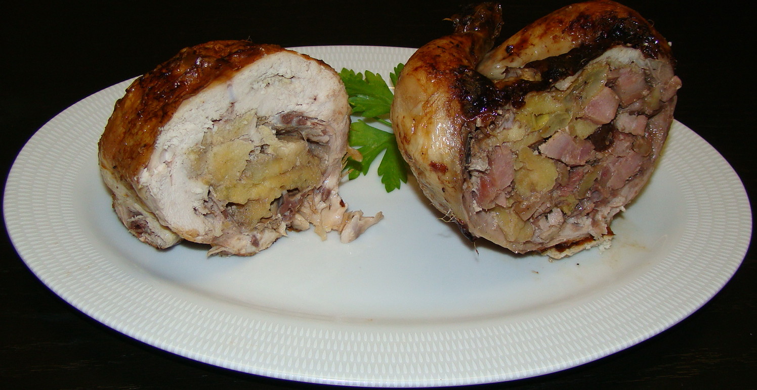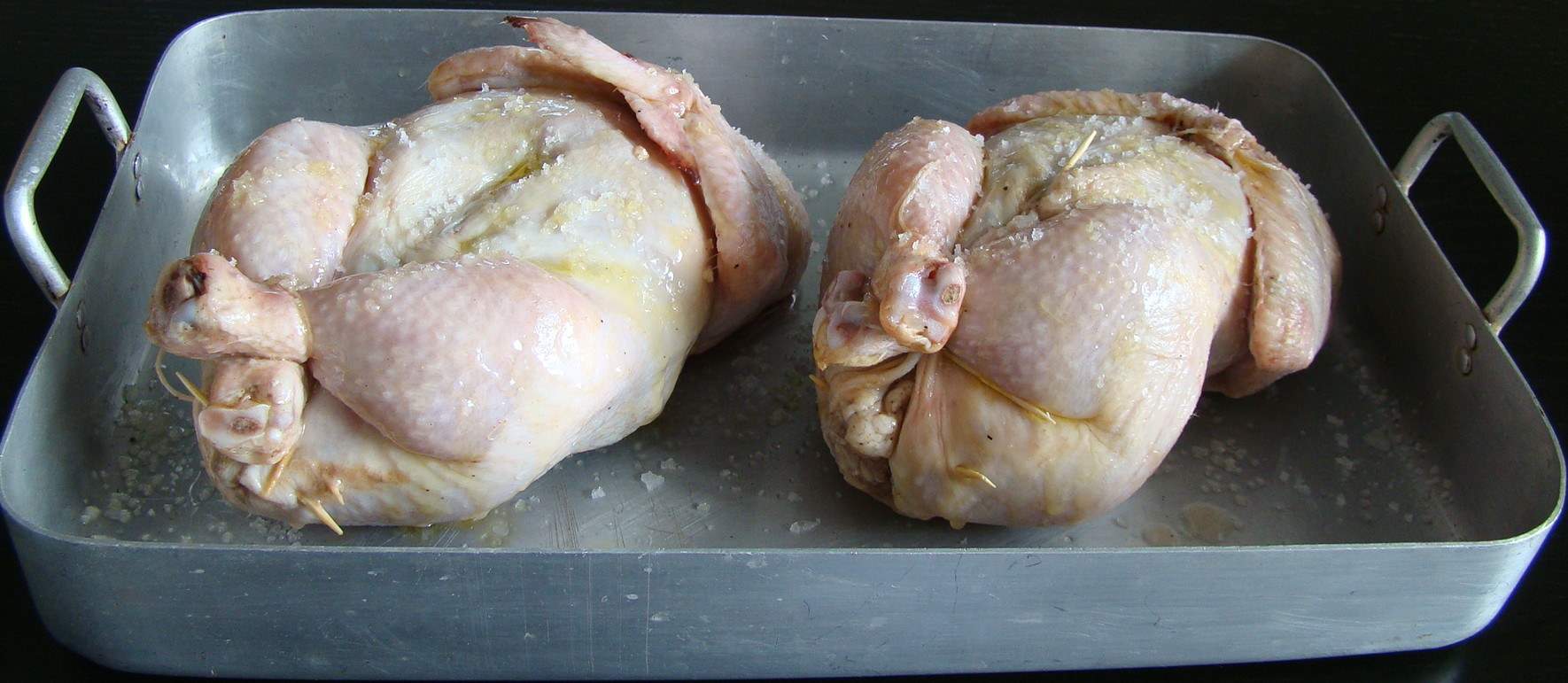 PREPARACIÓN: picamos la manzana, el bacon, las ciruelas y las nueces (es importante que queden en trocitos, no trituradas). Doramos el bacon y mezclamos todos los ingredientes añadiéndole las especias y la sal.Ahora rellenamos los pollos con la mezcla y cerramos con palillos, atando las patas y las alas con hilo de cocina tal y como se muestra en la primera foto. Untamos los pollos con el aceite y añadimos una pizca de sal gorda.