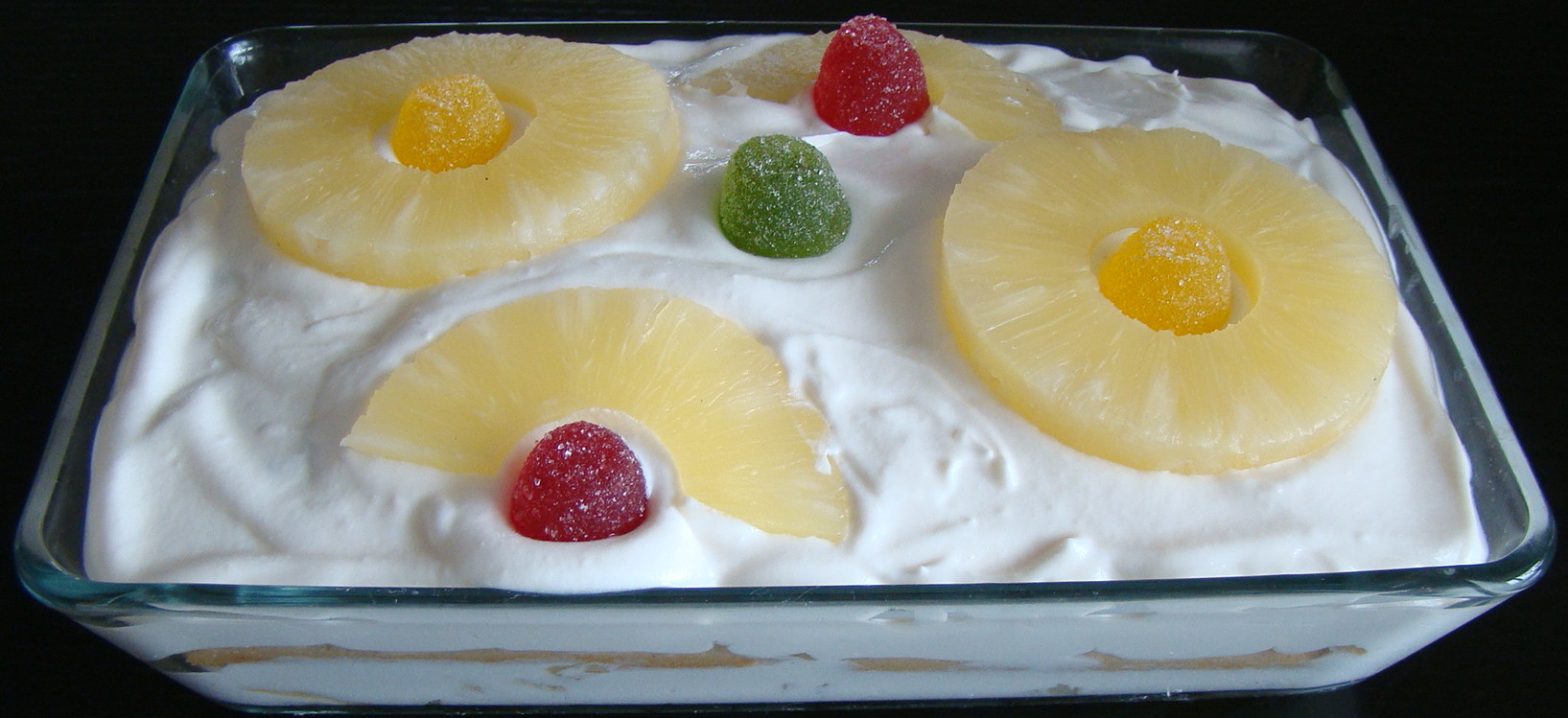 PREPARACIÓN: usamos la batidora de varillas para trabajar la nata mientras añadimos la leche poco a poco. Una vez que esté batida le añadimos 1 cucharada de azúcar y mezclamos. El líquido de la piña lo ponemos en un cuenco con una cucharada de azúcar y vamos mojando los bizcochos y poniendo en una bandeja de cristal. Añadimos una segunda capa de piña picadita, otra de nata y vamos repitiendo, bizcochos, piña, nata, hasta terminar todos los ingredientes. Podemos dejar 2 rodajas para adornar.