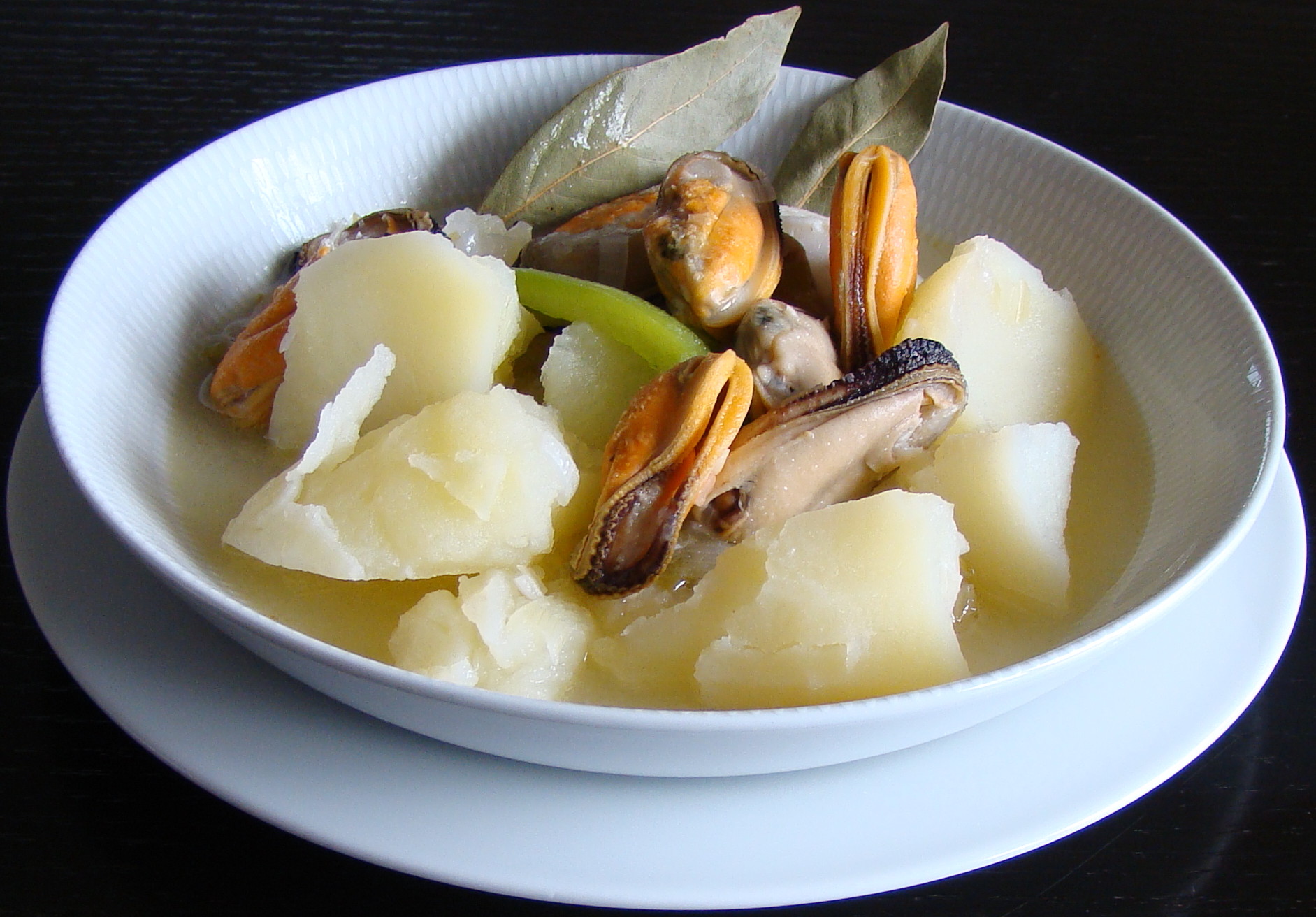 INGREDIENTES: 300 gramos de mejillones frescos, 1 lomo de merluza, 6 papas quinegua medianas, 1 cebolla tierna, 1 pimiento verde, 2 dientes de ajo, 1/2 vaso de vino blanco, 2 cucharadas de aceite de oliva y sal al gusto.