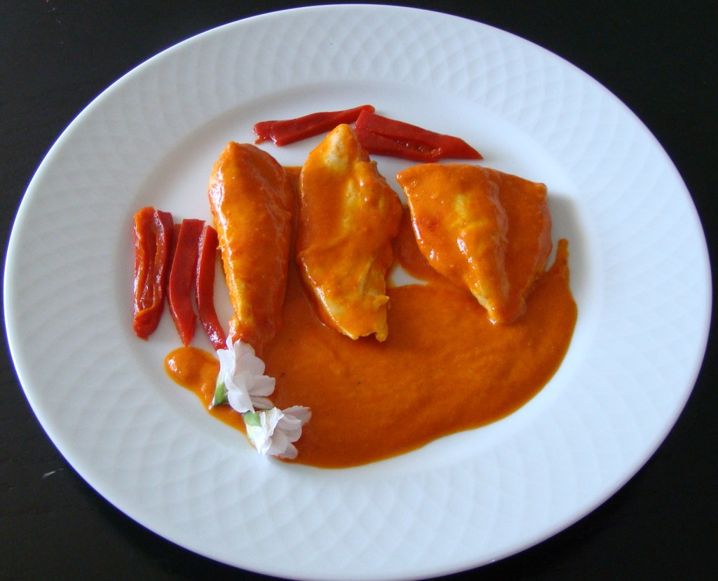 PREPARACIÓN: ponemos en una sartén una pizca de aceite, cuando esté caliente añadimos los trozos de pechuga vuelta y vuelta, sacamos y reservamos. Agregamos el resto de aceite y doramos los ajos, añadimos los pimientos removemos unos segundos, agregamos el vino, la sal, removemos, sacamos y trituramos. En un caldero o en la sartén ponemos la salsa, las pechugas, damos 2 minutos de cocción y apartamos.