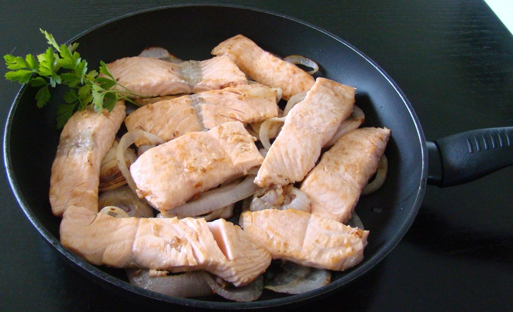 INGREDIENTES: 4 lomos de salmón abiertos, 2 cucharadas de aceite de oliva virgen y 2 cebollas grandes de guayonge.