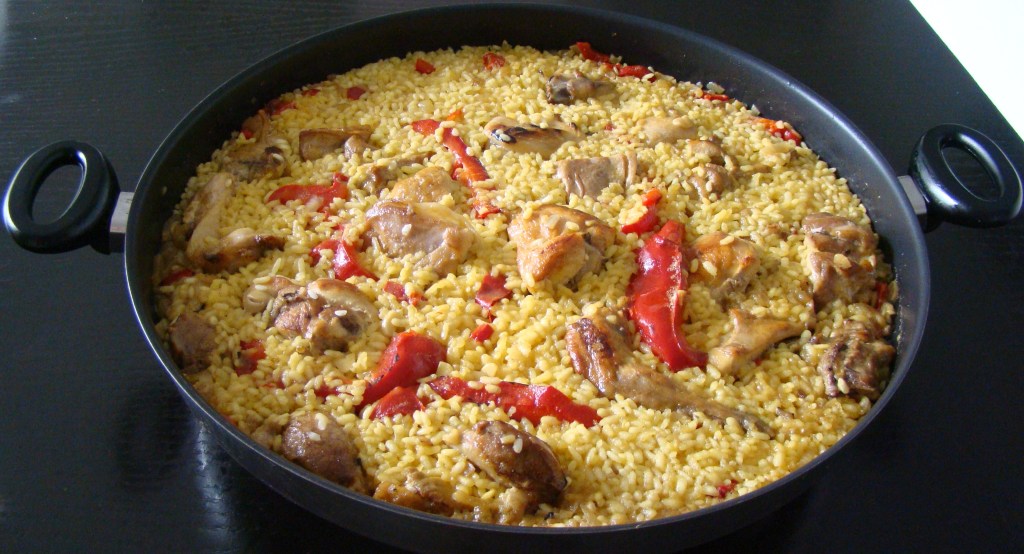 INGREDIENTES: 2 vasos de arroz, 400 gramos de conejo, 1/2 pollo cortado en trozos, 2 cucharadas de aceite de oliva virgen para el sofrito, aceite de oliva para freír la carne, 1 cebolla, 3 dientes de ajo, 2 cucharadas de brandy, 1 pimiento rojo y sal al gusto.