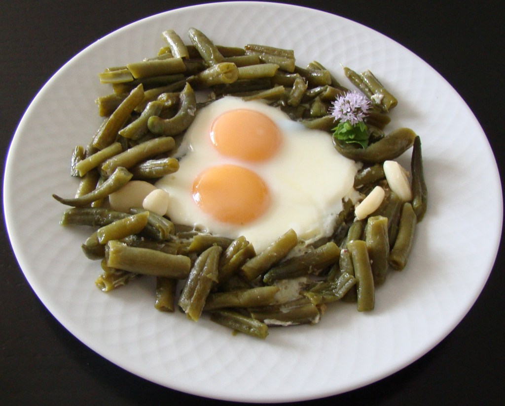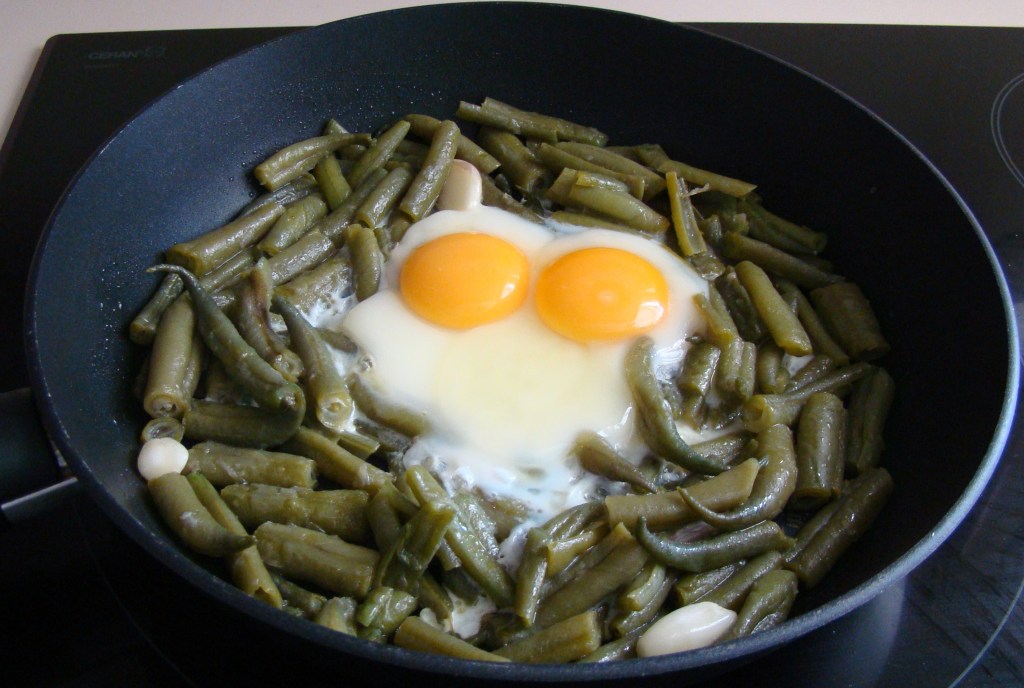 PREPARACIÓN: guisamos las habichuelas enteras con agua que las cubra y una pizca de sal durante 7 minutos; apartamos, escurrimos el agua y cortamos en trozos. Ponemos el aceite en una sartén con los dientes de ajo enteros, añadimos las habichuelas, salteamos, hacemos espacio para los huevos en el centro y dejamos que se hagan a nuestro gusto, apartamos y servimos.
