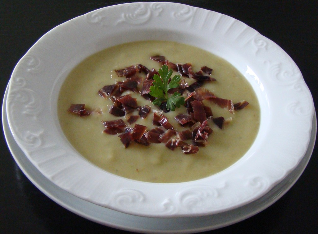 PREPARACIÓN: en un caldero adecuado ponemos el aceite, los ajos, las habichuelas, las papas y ponemos al fuego unos minutos hasta dorar los ajos, añadimos agua que cubra los ingredientes, la sal y guisamos durante 30 minutos. Apartamos, trituramos y al momento de servir añadimos el jamón picadito.