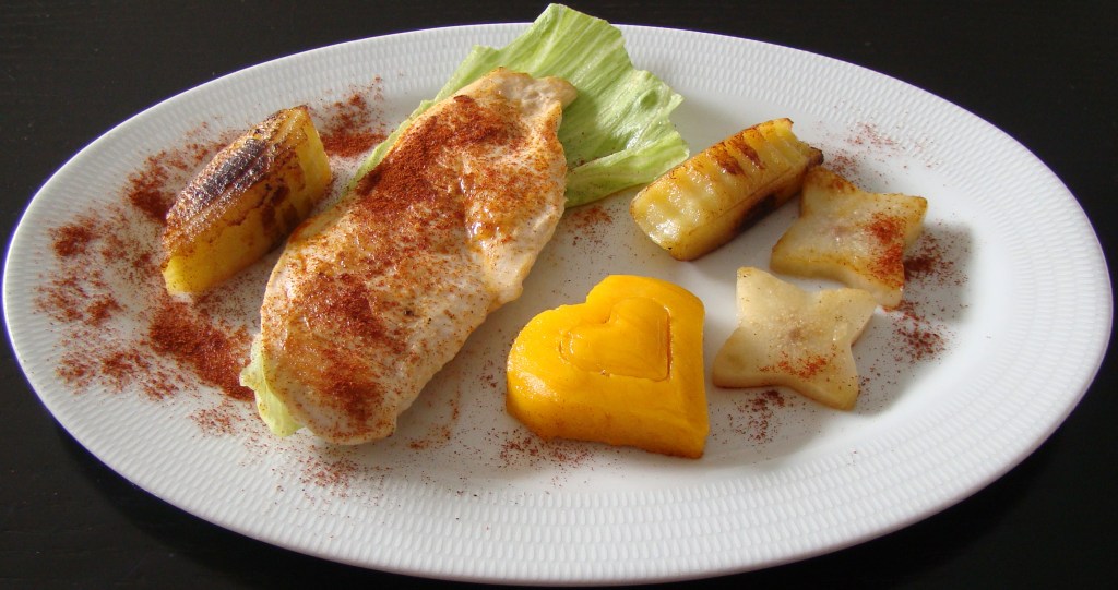 PREPARACIÓN: en una sartén que ponemos a calentar y sin aceite, asamos la pera (en este caso la hemos recortado en forma de estrella), y reservamos. Podemos utilizar dos sartenes para preparar todo al mismo tiempo. Asamos el plátano y reservamos. Asamos la pechuga y al darle la vuelta le ponemos la sal. Apartamos, emplatamos todo y añadimos el pimentón en el momento de servir.