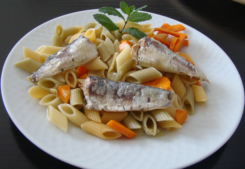 PREPARACIÓN: ponemos 1,1/2 litro de agua en un caldero y cuando hierva añadimos los macarrones y la sal. Damos 9 minutos de cocción, escurrimos y reservamos. Ponemos en la sartén una cucharada de aceite y hacemos un sofrito con los ajos, cebolla y zanahoria y lo añadimos a los macarrones, mezclamos y en el momento de servir ponemos las sardinas.