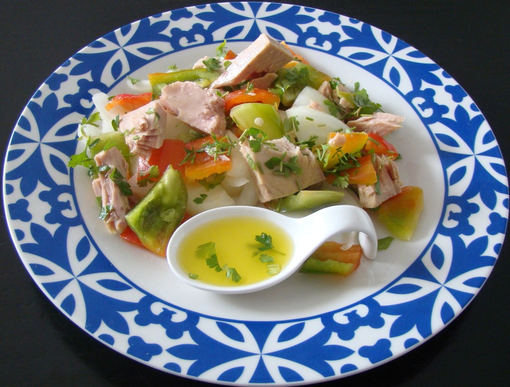 PREPARACIÓN: pelamos la cebolla, la cortamos en trozos no muy grandes picamos el pimiento y emplatamos añadiendo el atún, la vinagreta y finalmente el perejil picadito por encima.