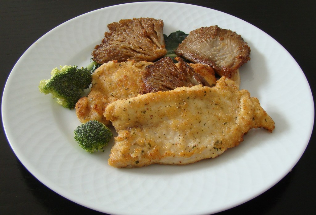 PREPARACIÓN: pasamos las pechugas por el pan rallado y las asamos en una sartén con el aceite caliente (1 cucharadita) y reservamos. Limpiamos la sartén con una servilleta y añadimos la otra cucharadita de aceite y asamos las setas. Servimos al momento añadiendo el brócoli.