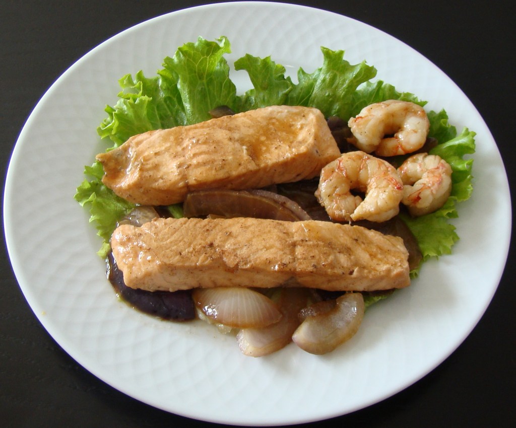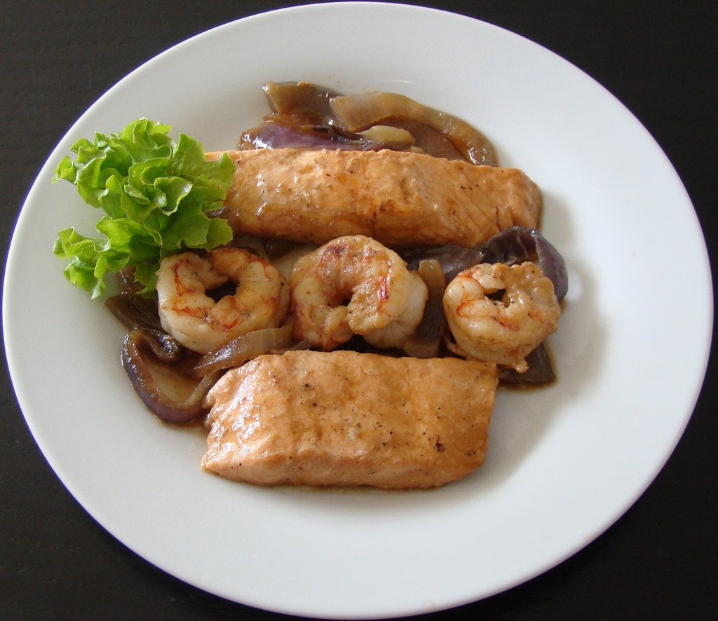 INGREDIENTES: 2 filetes de salmón, 1 cebolla roja, 2 dientes de ajo, 2 cucharadas de aceite de oliva, 2 cucharadas de Brandy, 3 cucharadas de agua, 1 pizca de pimienta negra molida, 6 gambones y sal al gusto.