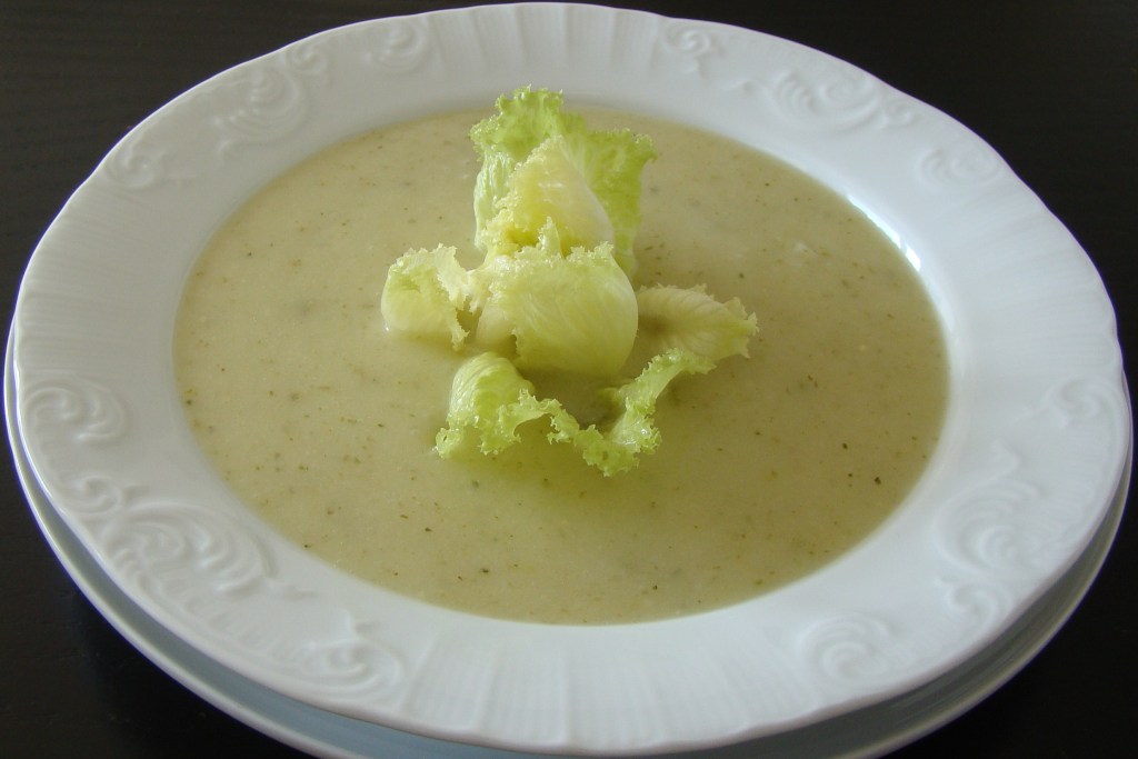 PREPARACIÓN: en un caldero ponemos el aceite con los ajos, la cebolla y sofreímos, añadimos el calabacín troceado y las papas, añadimos agua que cubra; guisamos durante 3o minutos; agregamos la lechuga y dejamos 5 minutos más de cocción. Apartamos y trituramos.