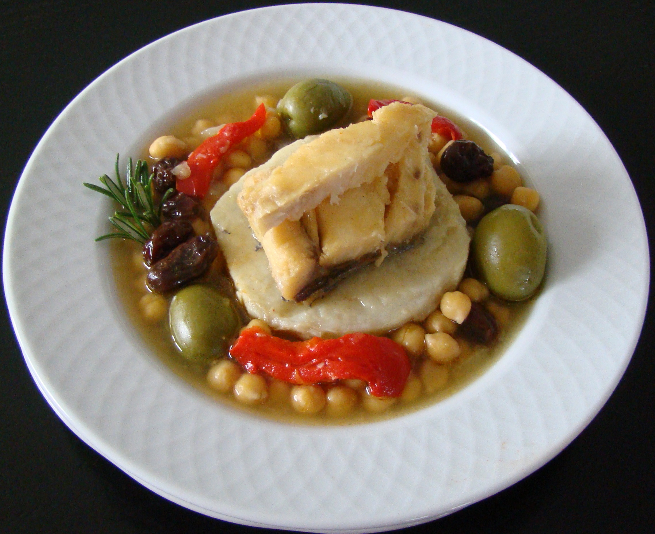 PREPARACIÓN: ponemos a desalar el pescado un día antes, lavamos y ponemos los garbanzos en remojo toda la noche. Hacemos el sofrito con los ajos, la cebolla y el pimiento cortado en trozos, añadimos el vino, el agua aproximadamente 1 litro y cuando esté tibia añadimos los garbanzos y guisamos durante 40 minutos. Comprobamos que están cocidos y añadimos la batata pelada y el pescado, seguimos la cocción durante 12 minutos más, apartamos, dejamos reposar 15 minutos y servimos.