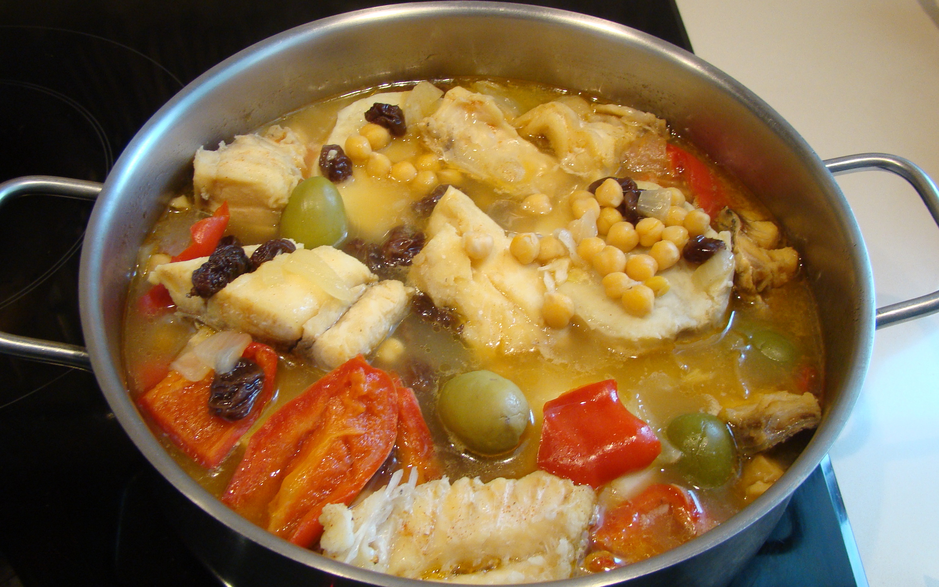 INGREDIENTES: 200 gramos de garbanzos, 8 trozos de corvina salada, 1 cebolla, 2 dientes de ajo, 1 pimiento encarnado, 3 cucharadas de aceite de oliva, 1 vaso de vino blanco, 1 batata blanca, 1 cucharadita de pimentón dulce y sal al gusto.
