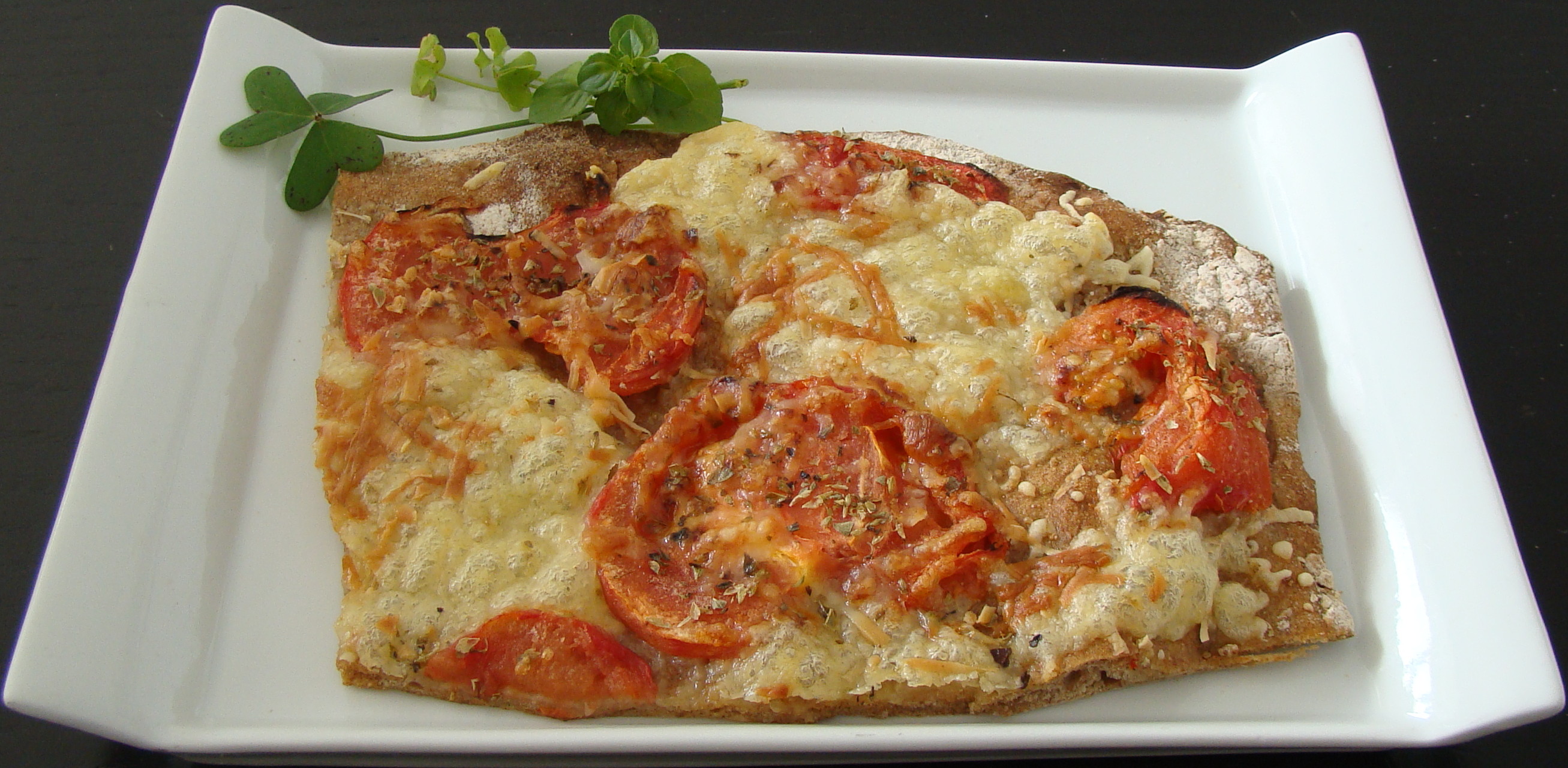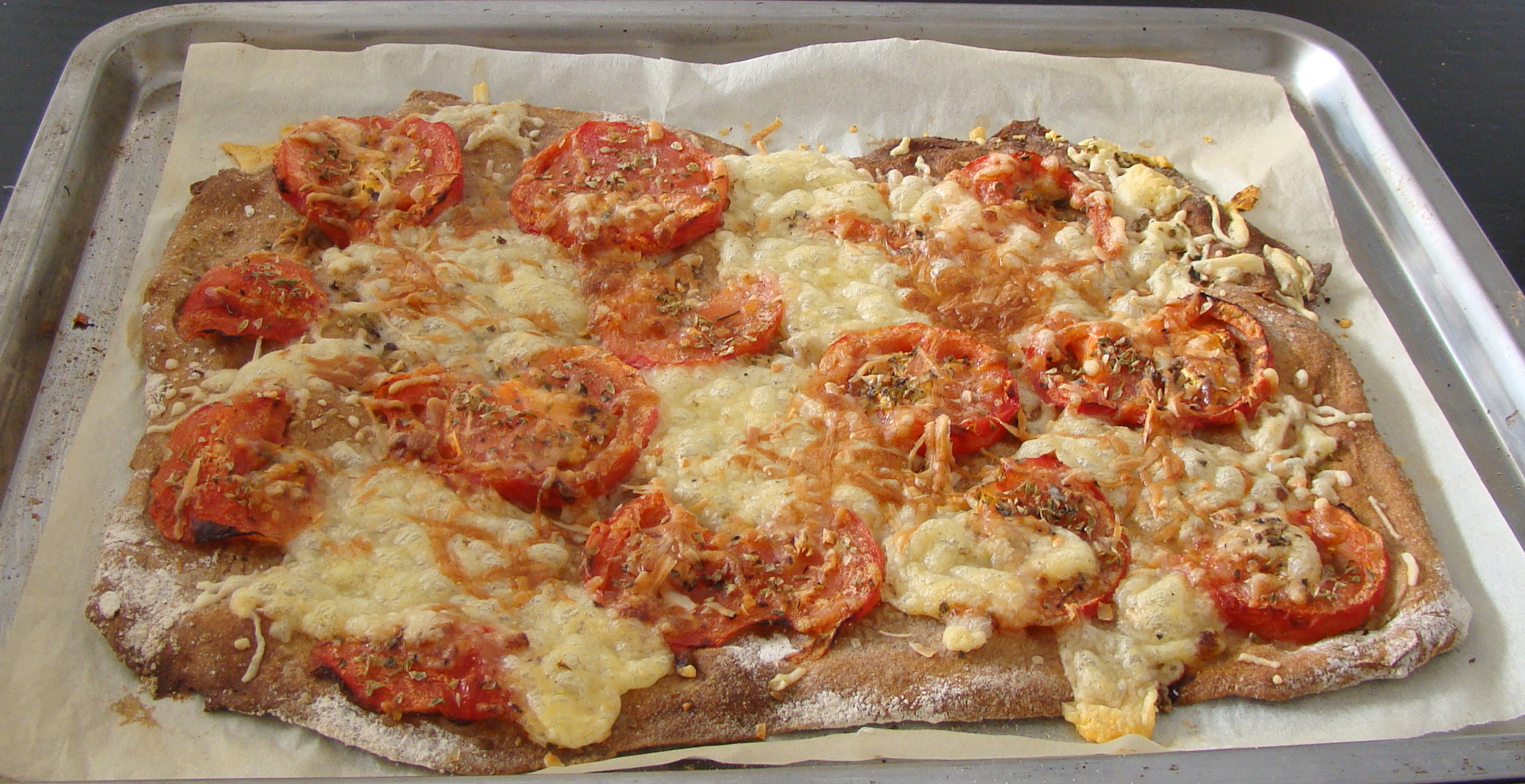 INGREDIENTES: 1 vaso de harina de trigo integral, 1 cucharada de aceite de oliva virgen, 1/2 vaso de agua, 1 cucharadita de levadura, 1 tomate grande maduro, 1 pizca de sal y 100 gramos de queso de fundir.