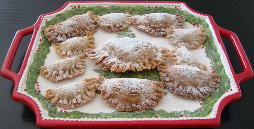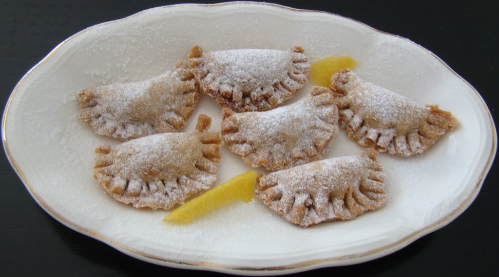 PREPARACIÓN: ponemos en un cuenco la harina, el aceite, el vino y si es necesario un poco de agua, amasamos y ponemos en una superficie plana, hacemos una bola y dejamos en reposo durante 30 minutos cubierto con papel film transparente. Transcurrido ese tiempo, estiramos con el rodillo hasta conseguir una lámina fina y con un vaso (usaremos un vaso más o menos ancho dependiendo del tamaño que queramos darle a las truchas) recortamos la masa. En el centro del círculo ponemos el relleno, doblamos con suavidad cubriendo el relleno, rematamos los bordes con un tenedor y vamos friendo. Al apartarlas, las ponemos sobre papel absorbente o servilletas para eliminar el aceite y cuando estén frías las espolvoreamos con azúcar glass.